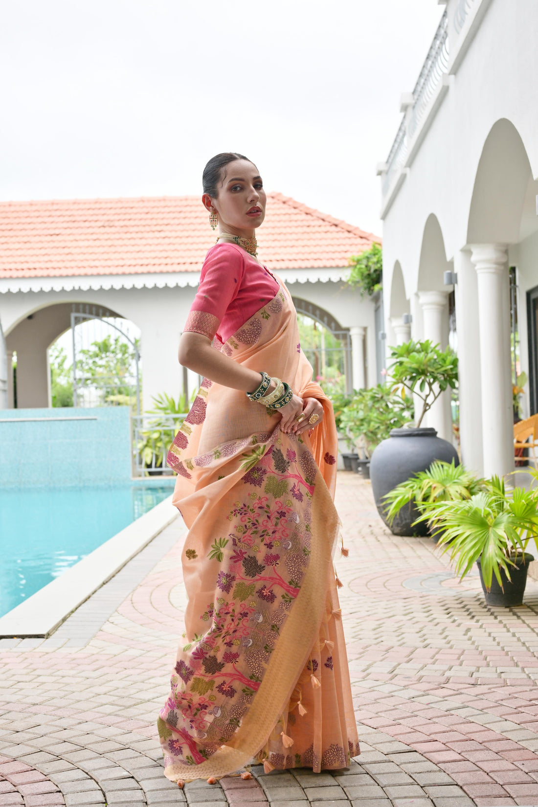 Premium soft Muga Cotton saree with Pichwai type weaving pallu and all over unique floral...