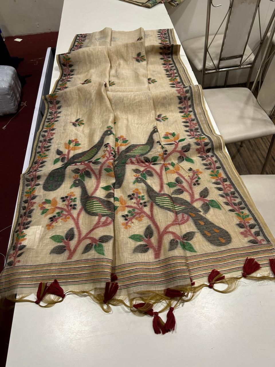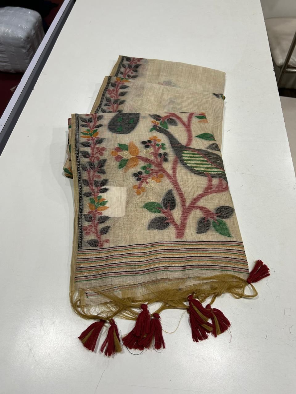 Premium soft Muga Cotton saree with classic peacock and jamdani type weaving pallu with very decent colour touchup on pallu and all over weaving buttis with fancy tassels and running blouse piece