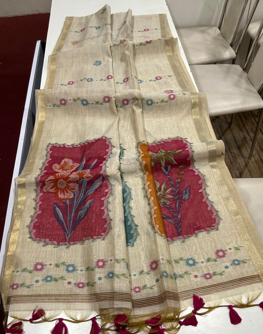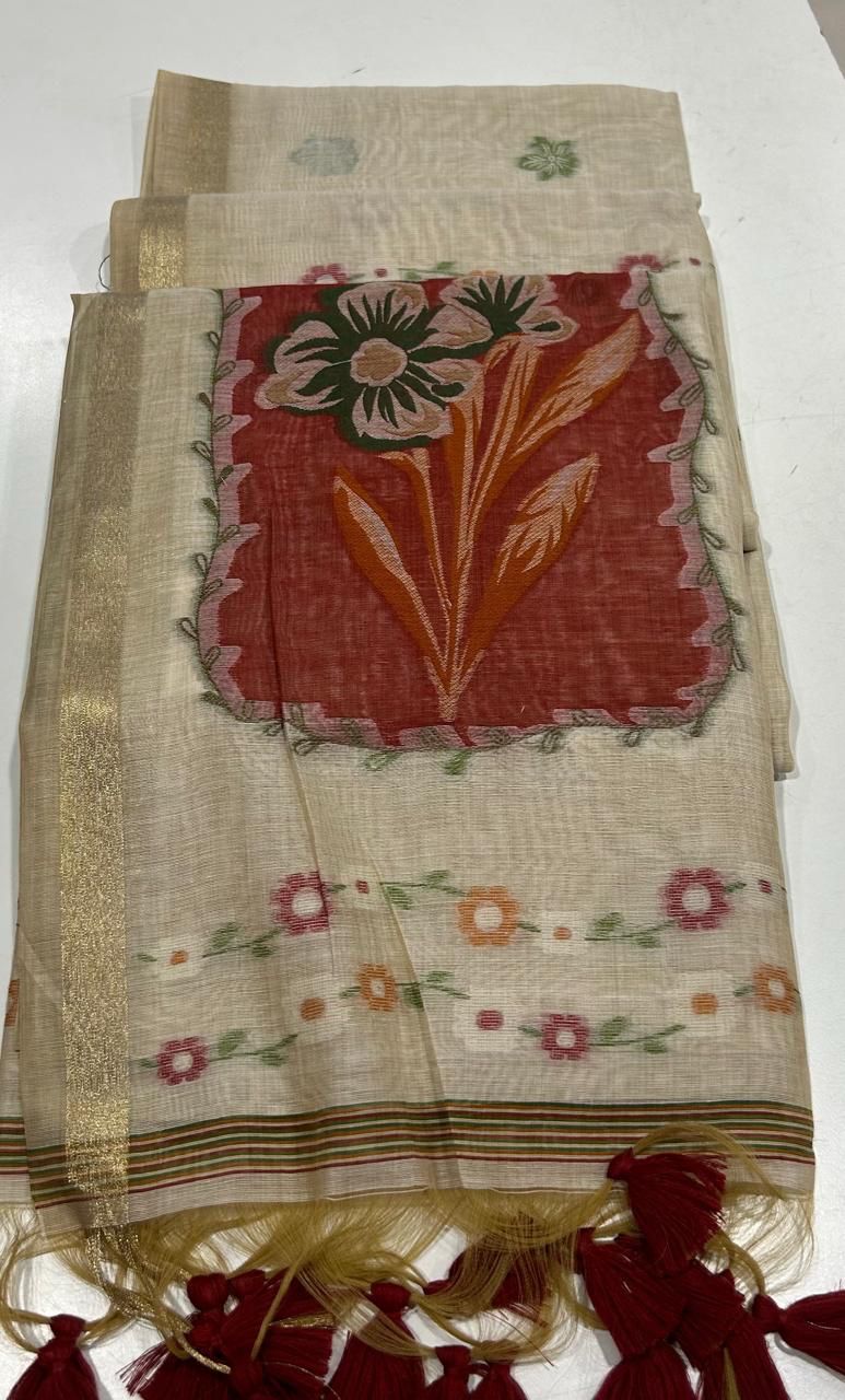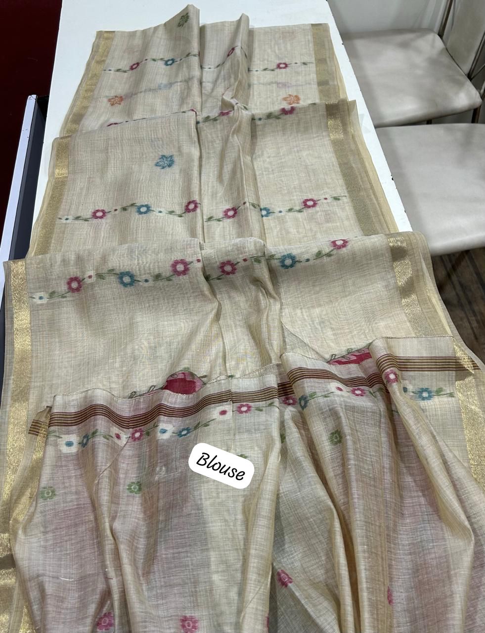 PREMIUM SOFT MUGA COTTON SAREE WITH CLASSIC COLOURFULL RESHAM WEAVING FLORAL PALLU AND TINY ZARI WEAVING BORDER AND ALL OVER WEAVING BEAUTIFUL JAL WITH FANCY TASSELS AND RUNNING BLOUSE PIECE