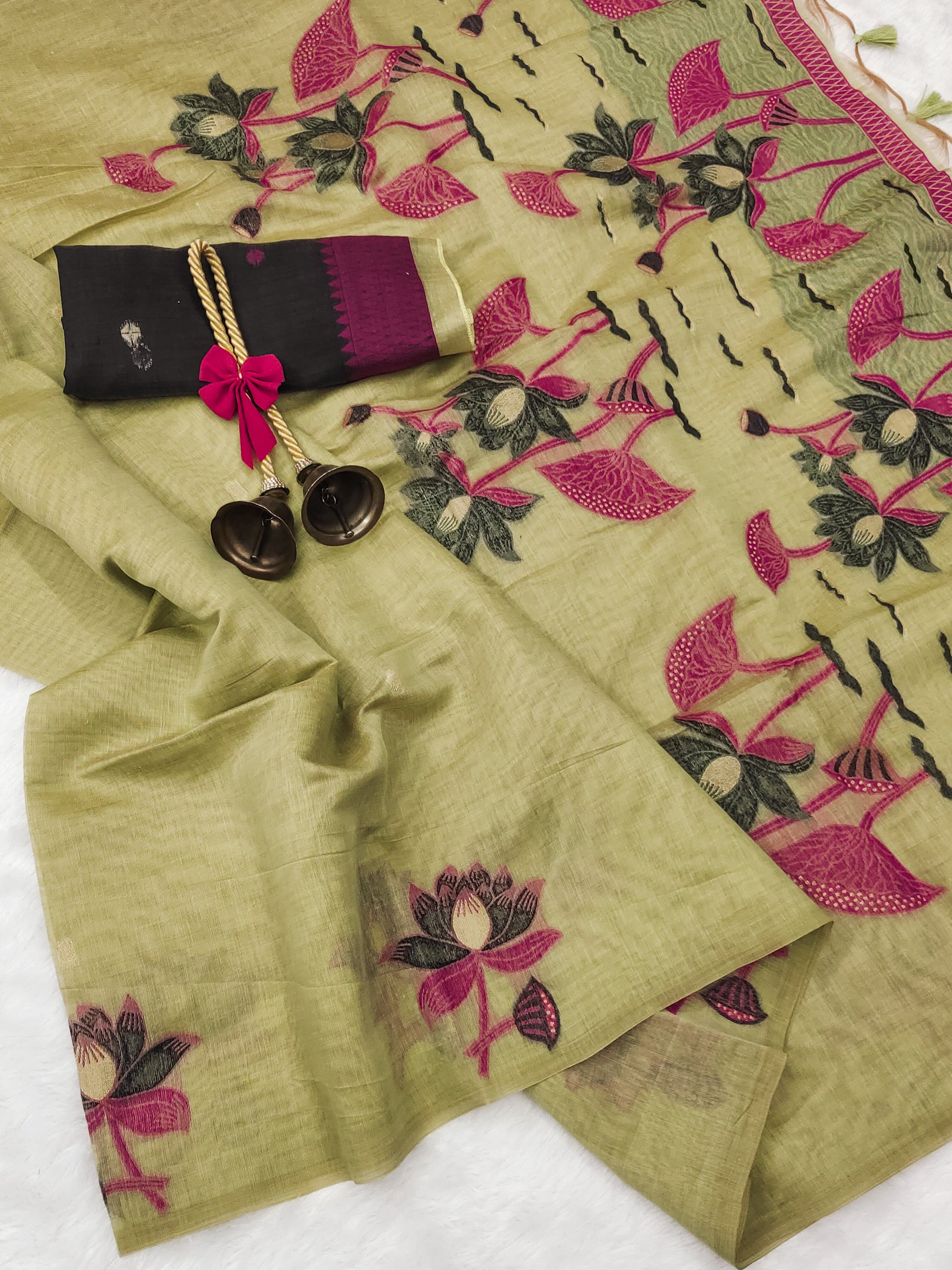 Premium soft Muga Cotton saree with classic colourfull pichwai type lotus weaving pallu with very decent colour touchup on border and all over weaving buttas with fancy tassels and contrast blouse piece