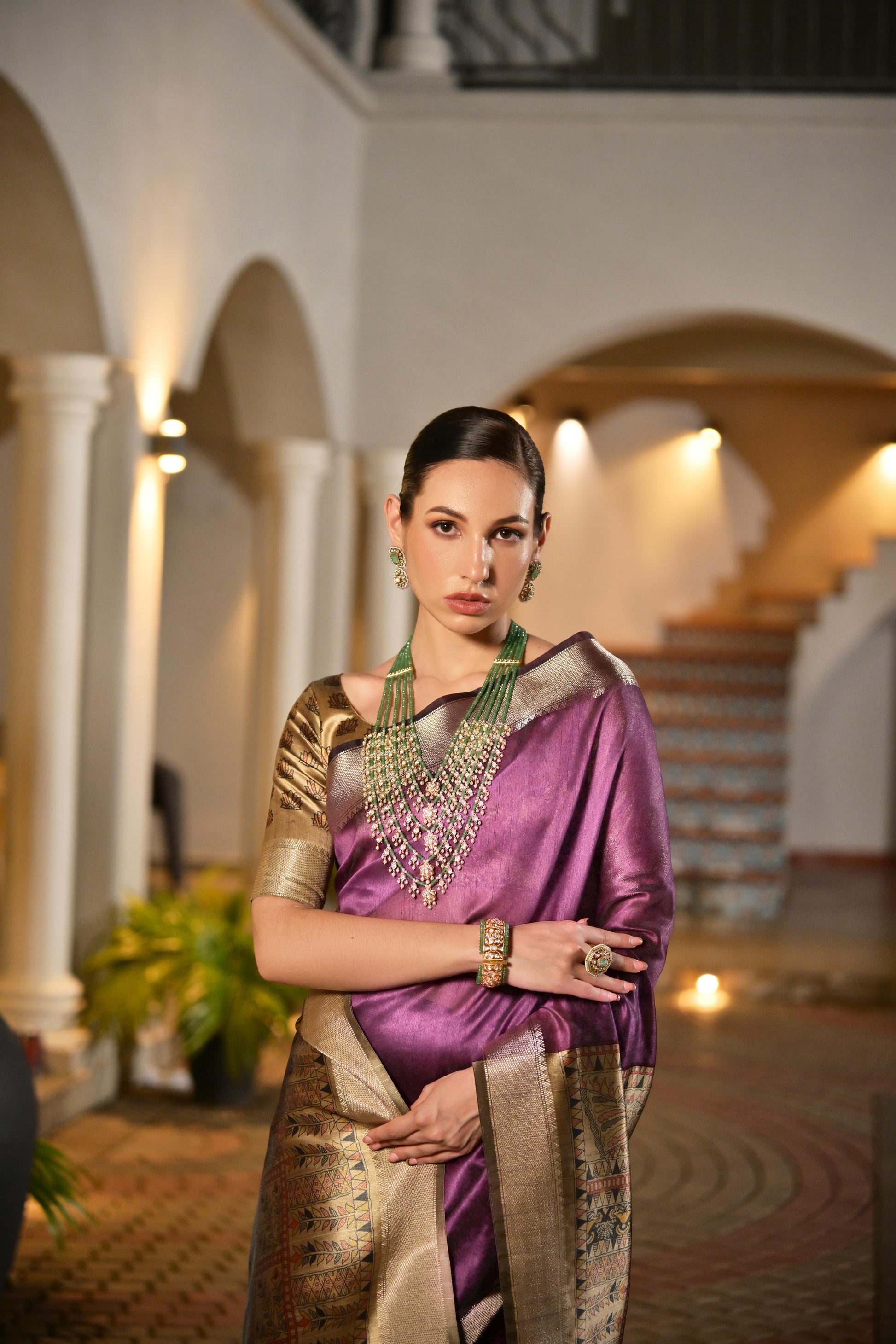 | Soft Khadi Raw silk saree with traditional hand painted madhubani pallu and zari weaving temple border with extraordinary lotus printed blouse piece |
