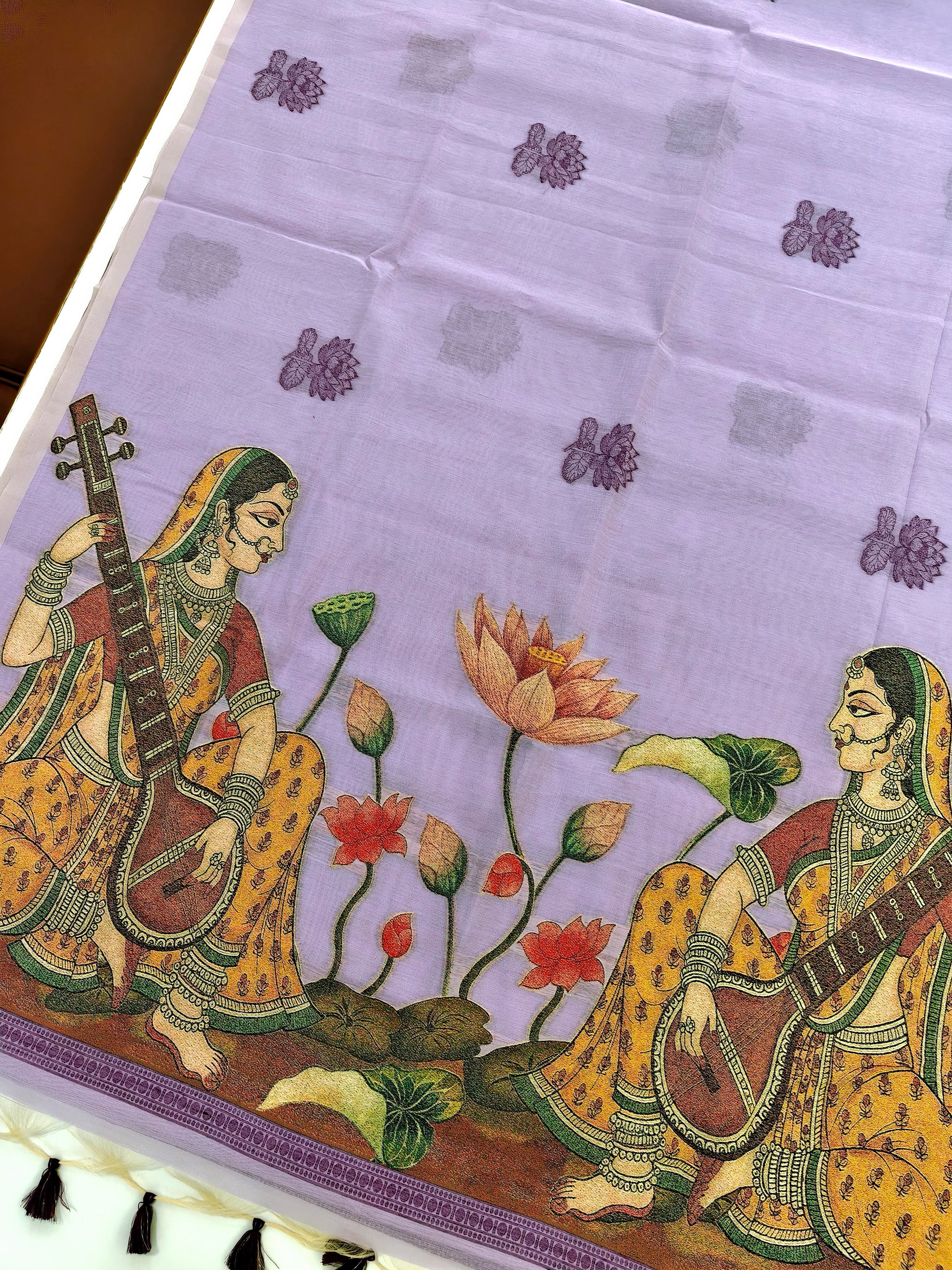 Premium Soft Chanderi cotton saree with traditional Mithila pattern weaving pallu which gives pretty look with all over weaving Shaded lotus and fancy tassels with Contrast blouse piece