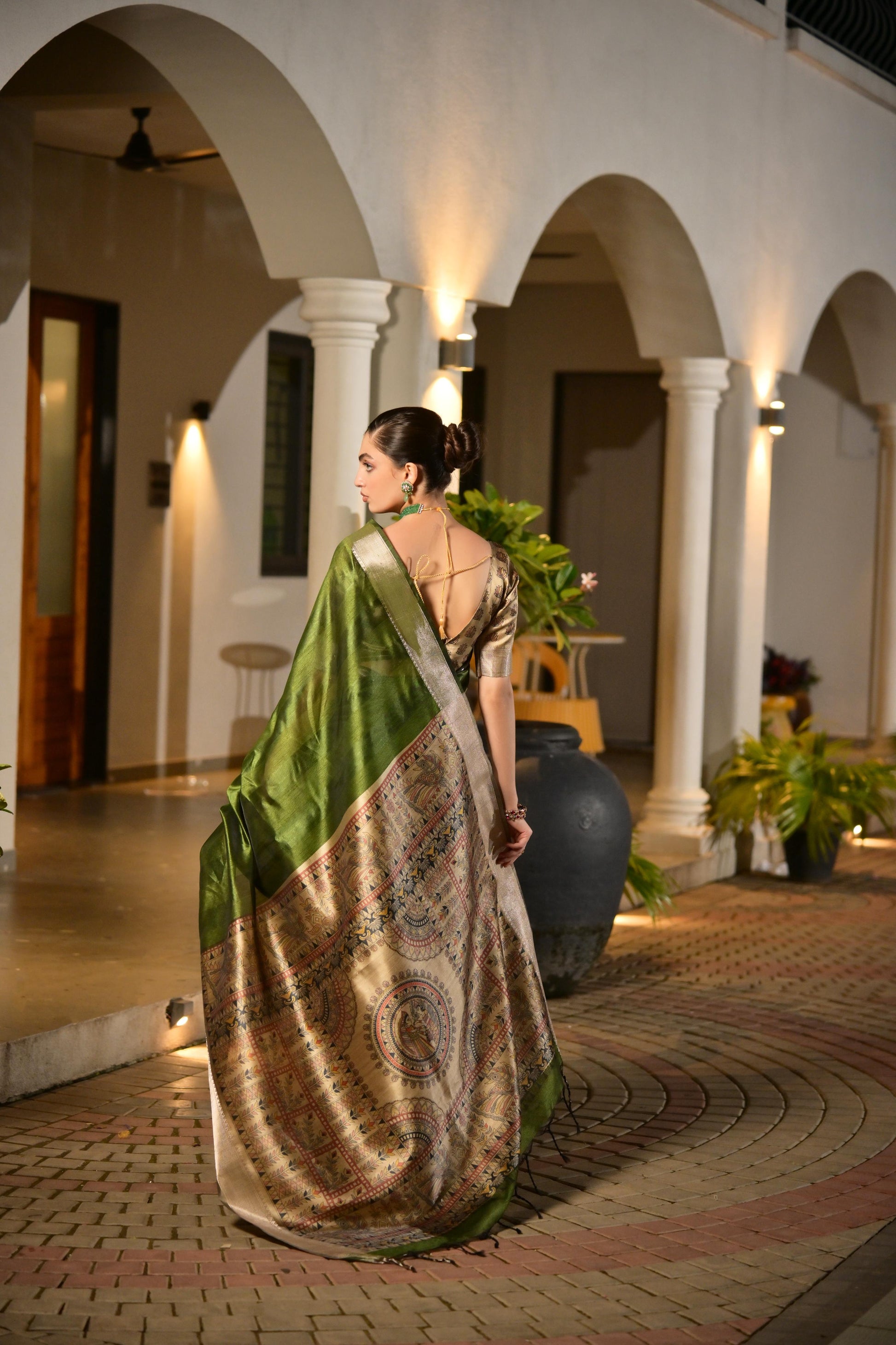 | Soft Khadi Raw silk saree with traditional hand painted madhubani pallu and zari weaving temple border with extraordinary lotus printed blouse piece |