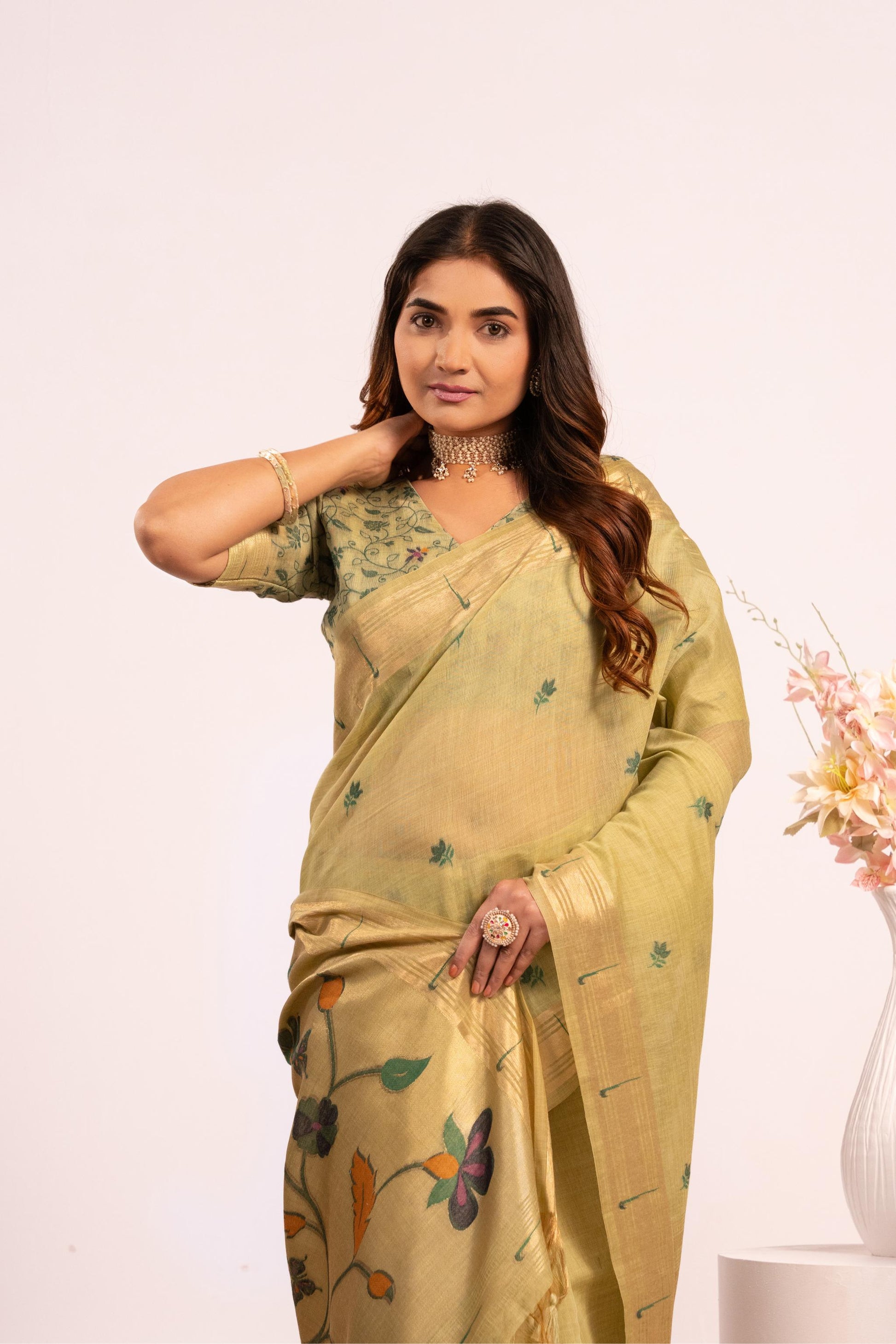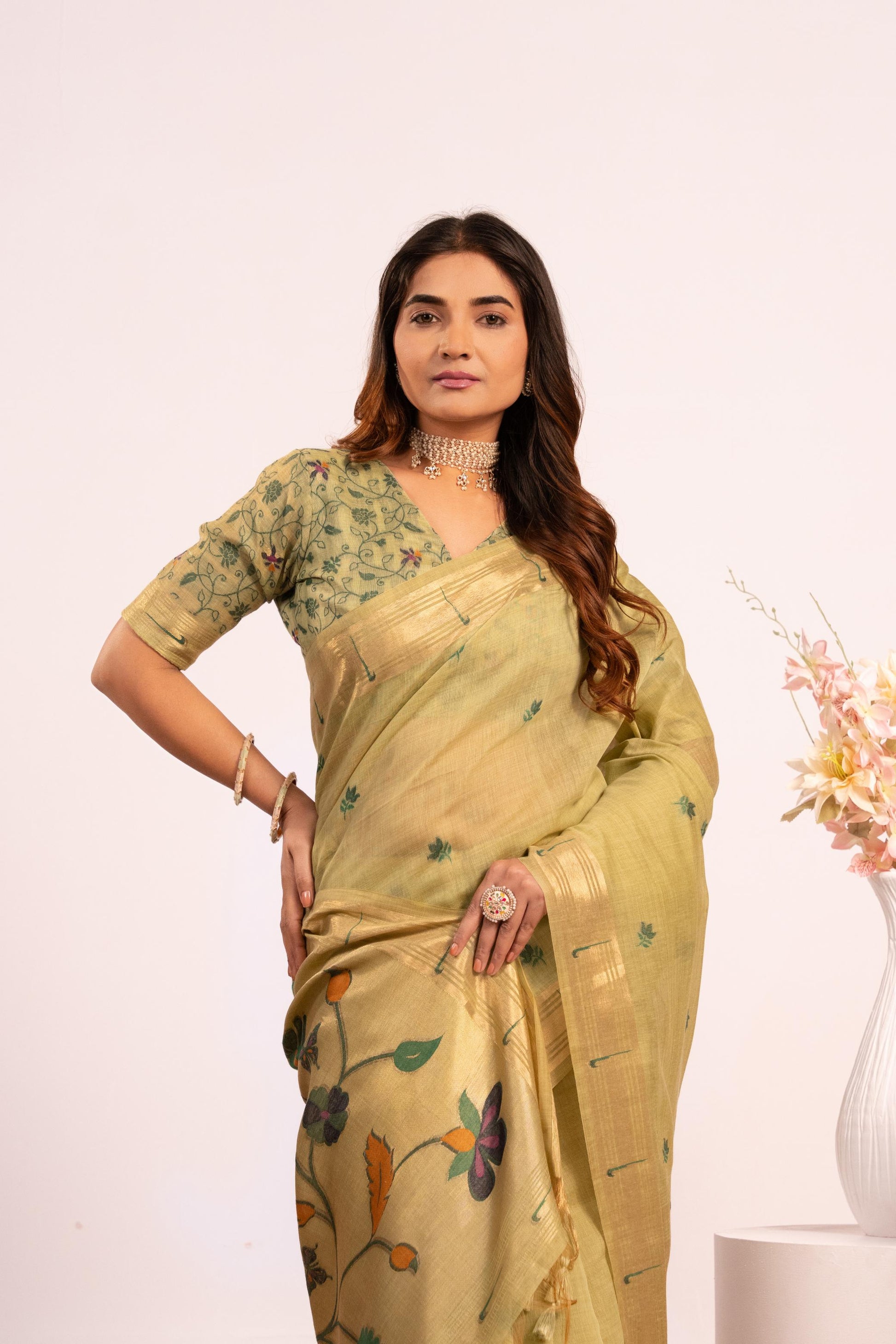 Premium Soft moga cotton paithani sare weith classic resham weaving paithani pallu and muniya weaving zari border with all over weaving butties and contrast fully weaved blouse piece