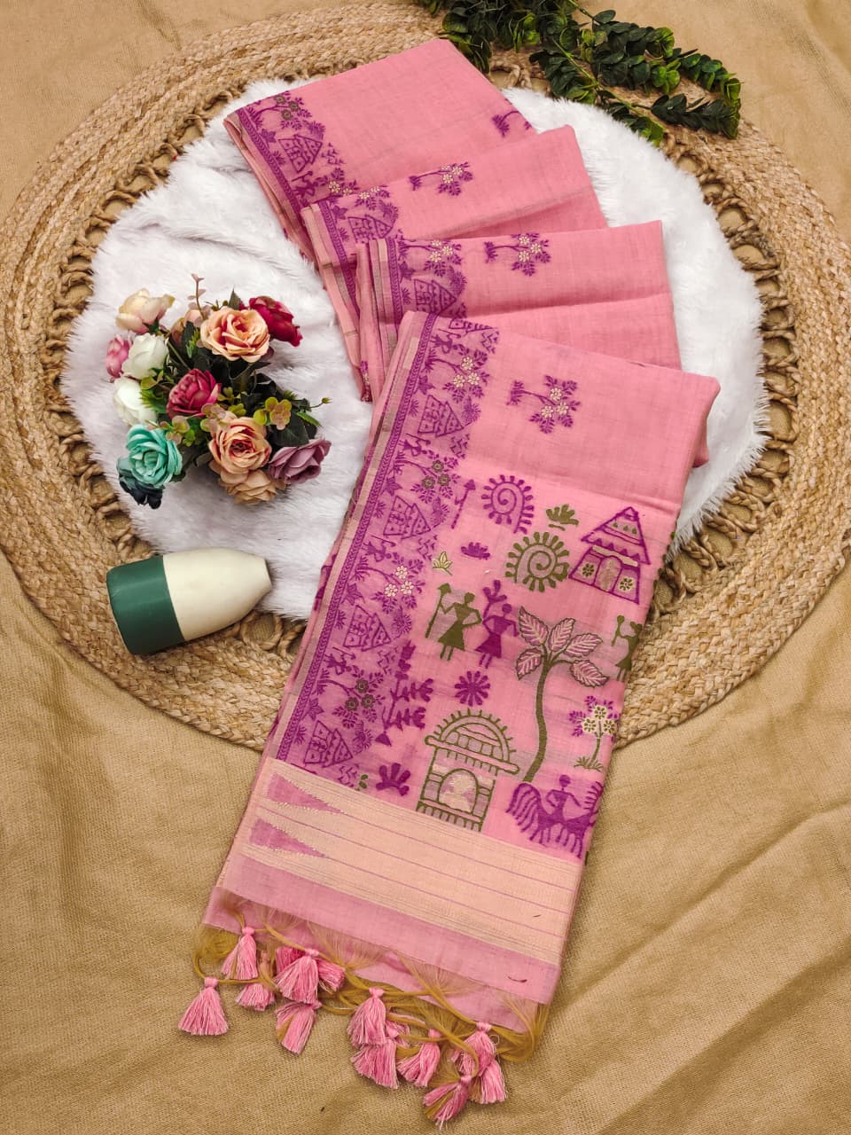 Premium Soft Chanderi cotton saree with classic warli concept pallu and contrast weaving border with all over weaving butties and Contrast blouse piec