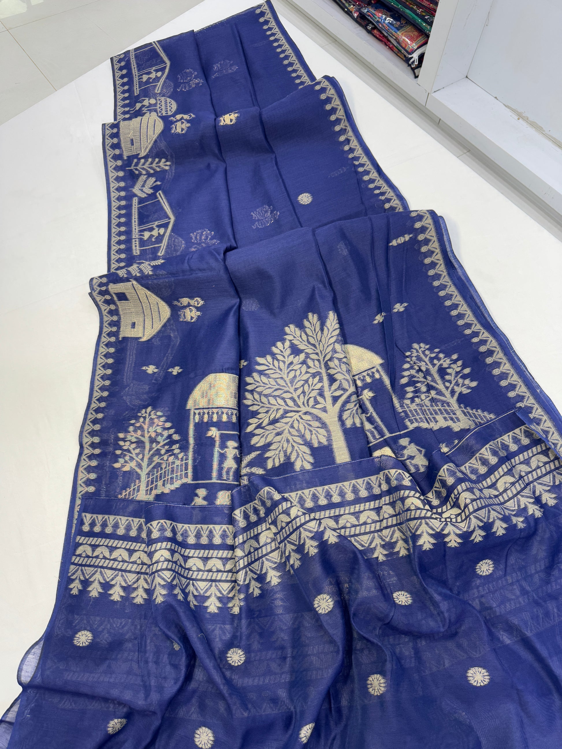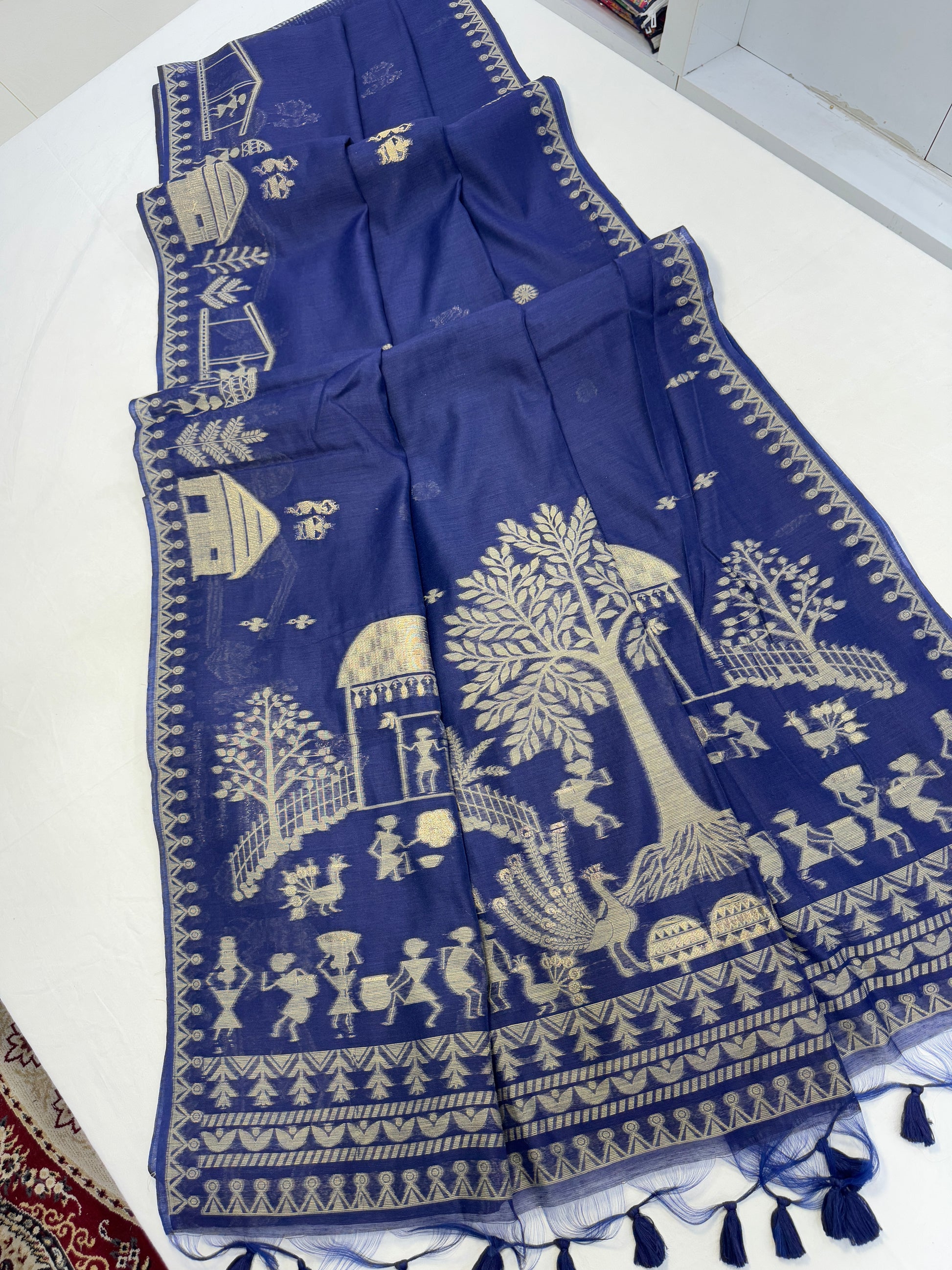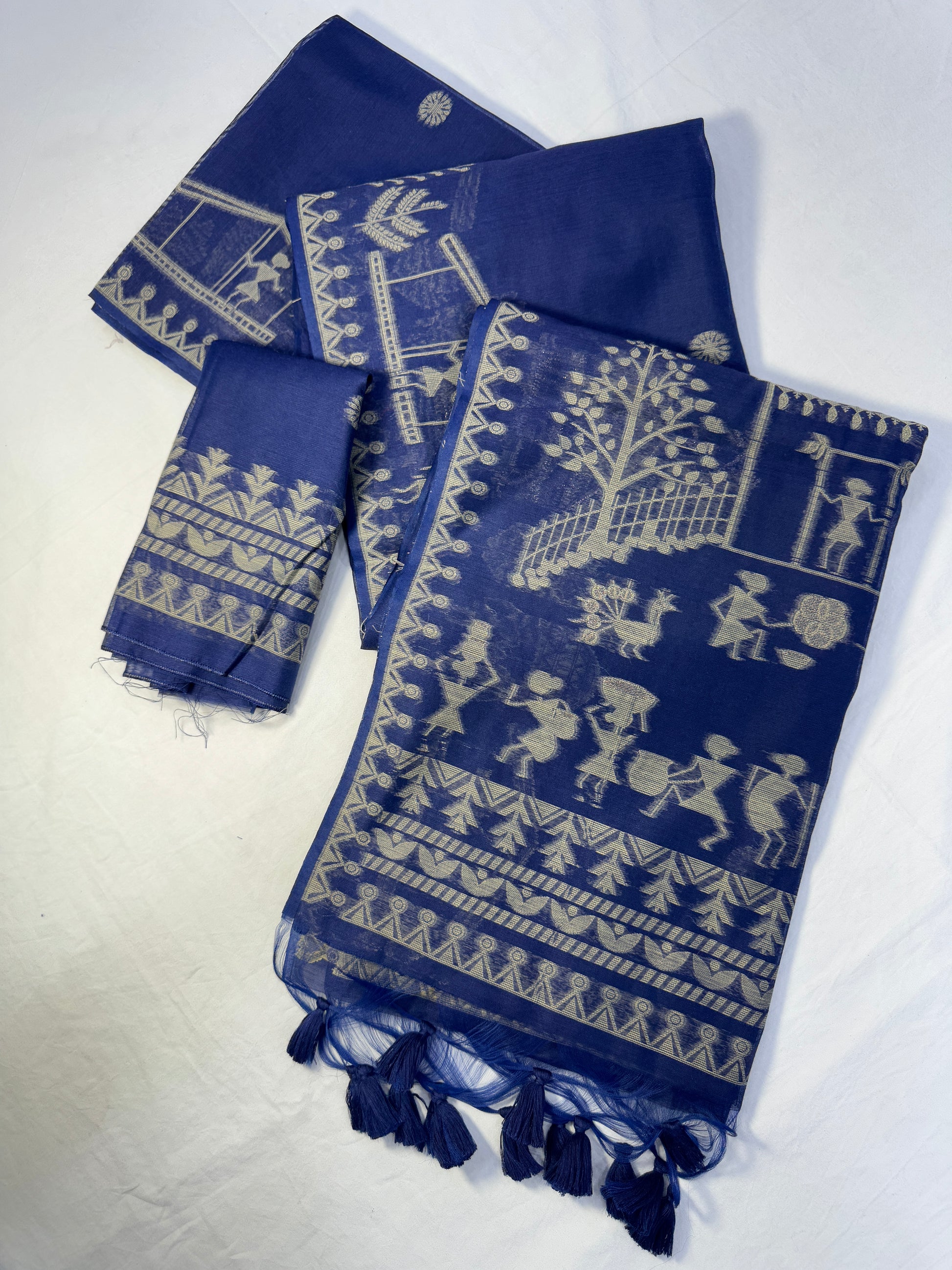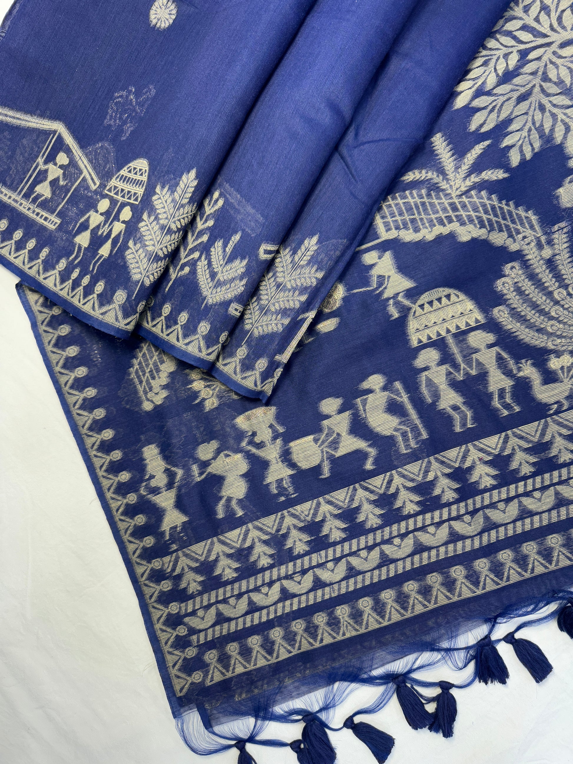 Premium soft muga cotton saree with warli weaving pallu and all over weaving buttas with classic warli weaving border and tassels and running blouse piece