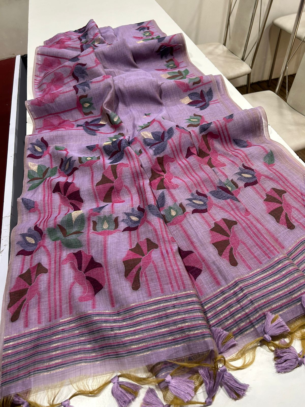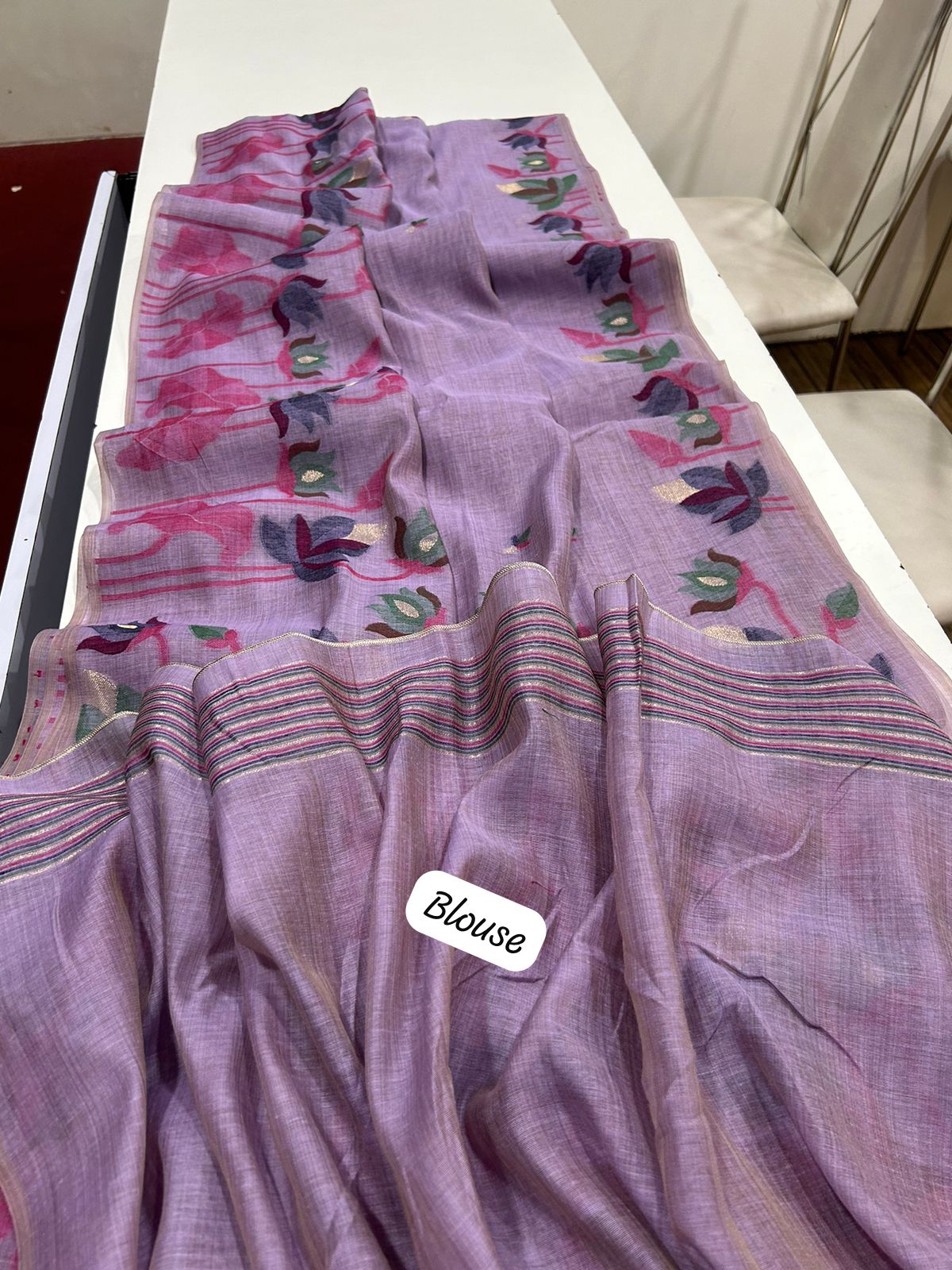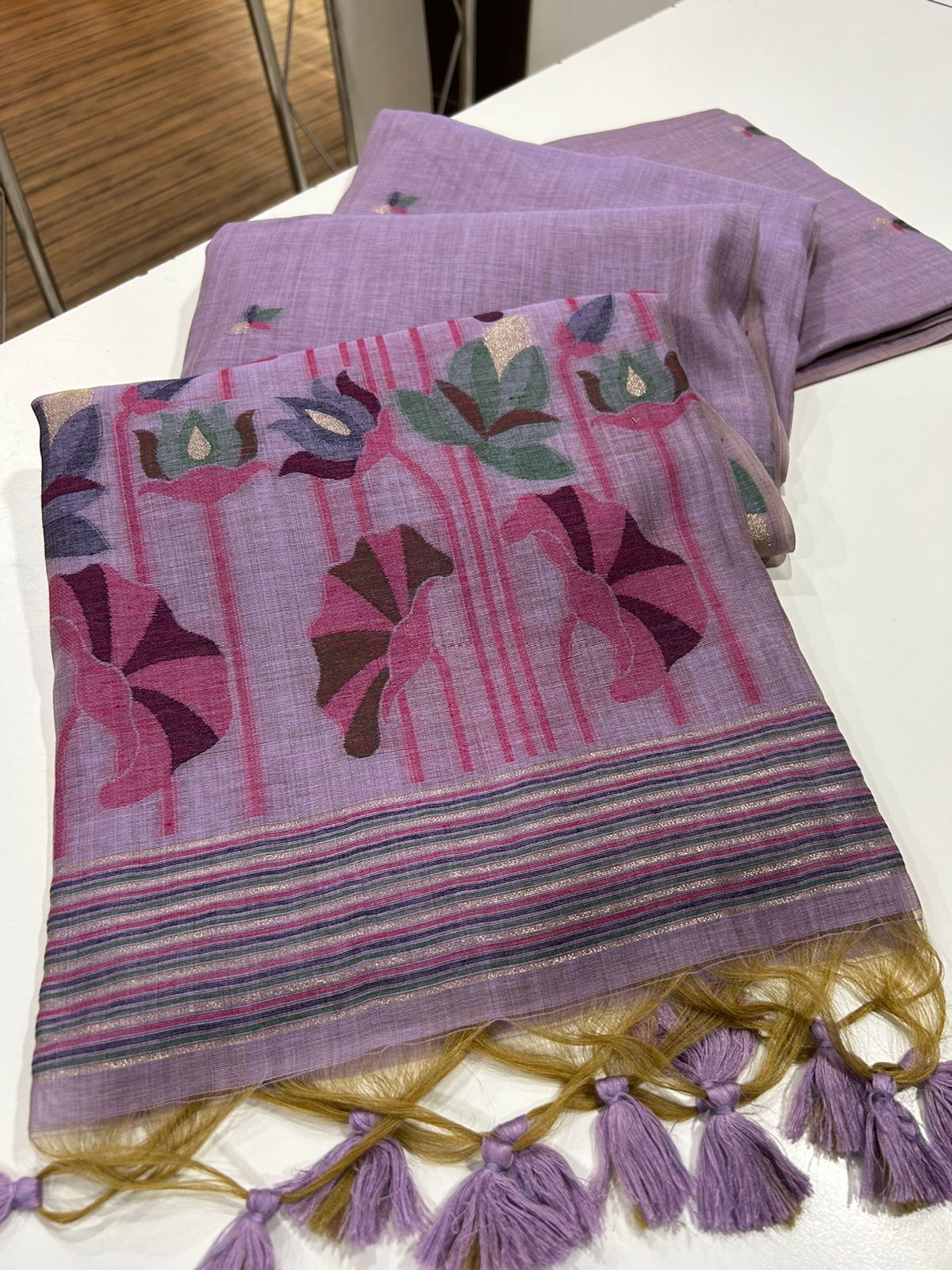 Premium soft Muga Cotton saree with classic colourfull resham weaving jamdani type pallu with very decent colours and traditional lotus weaving border and all over resham weaving butties and fancy tassels with running blouse piece