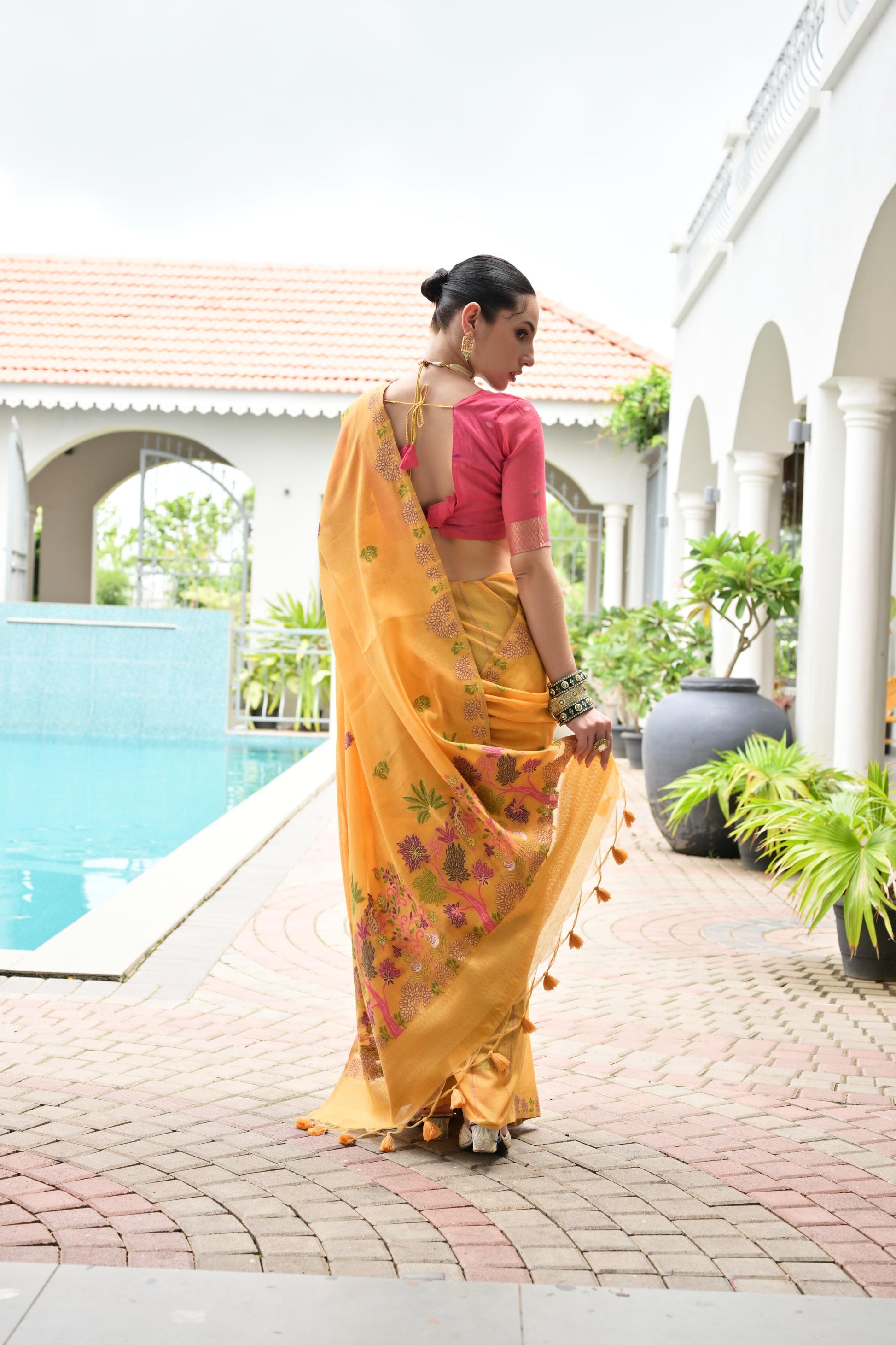| Premium Soft Chanderi cotton saree with classic resham weaving Flower pallu and Flower weaving border with all over weaving butties and Contrast blouse piece |