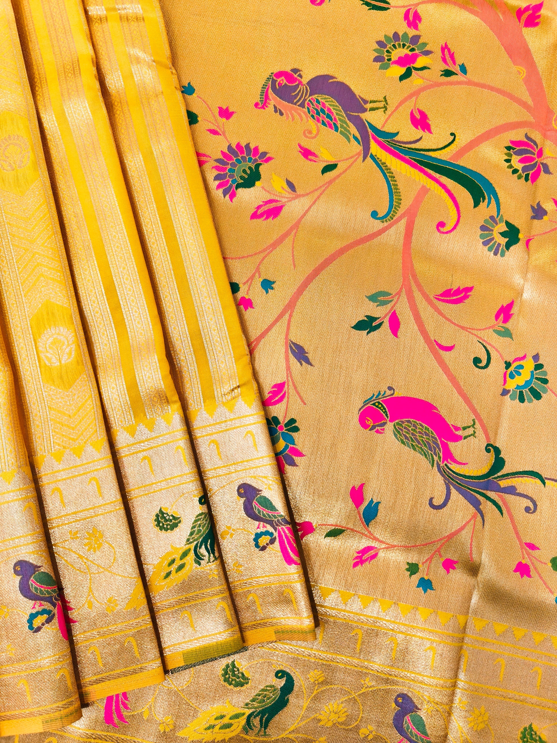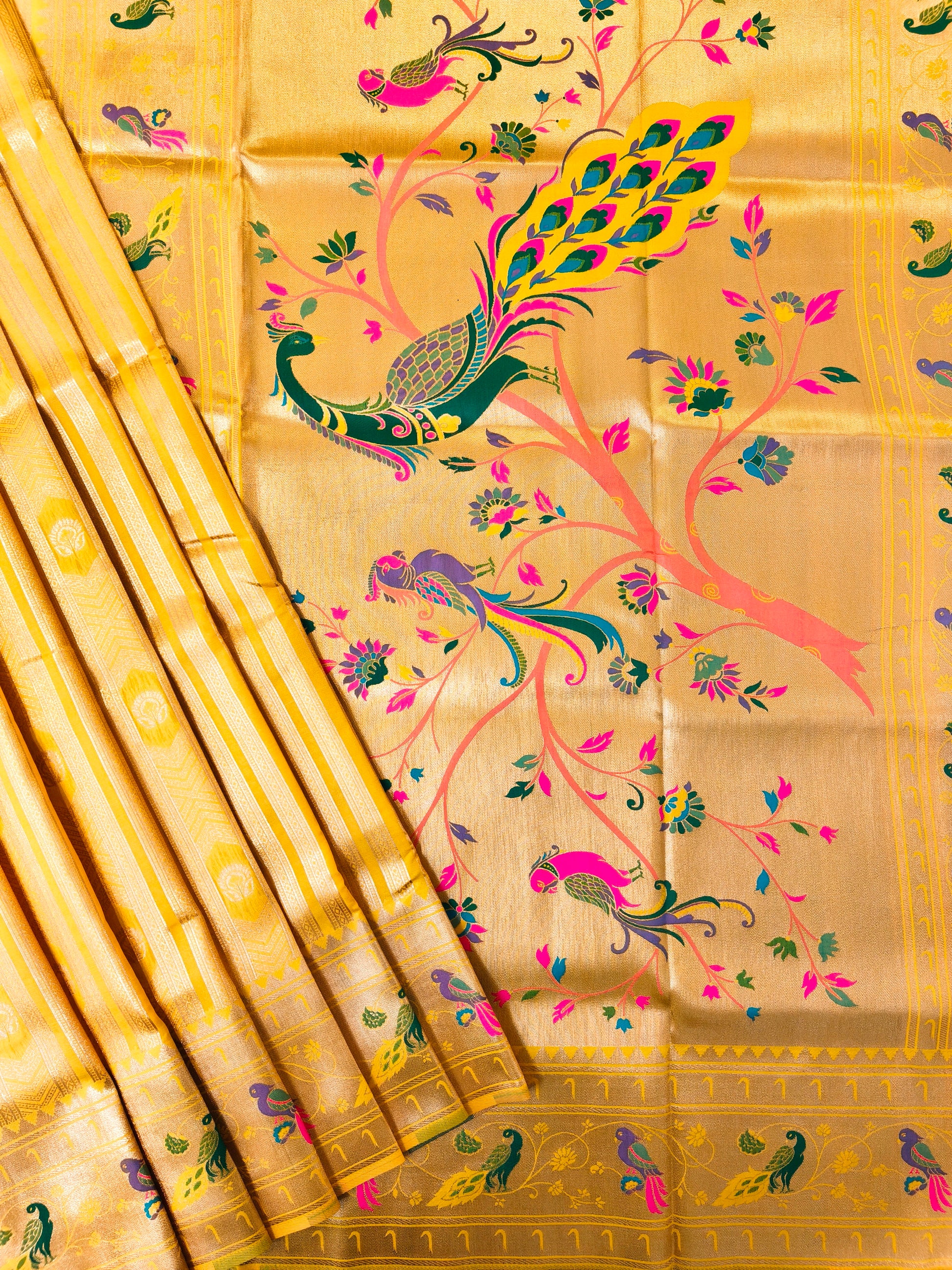 Premium Soft Paithani Silk Saree with rich zari woven pallu and zari woven border with all over zari strips pattern with running blouse piece