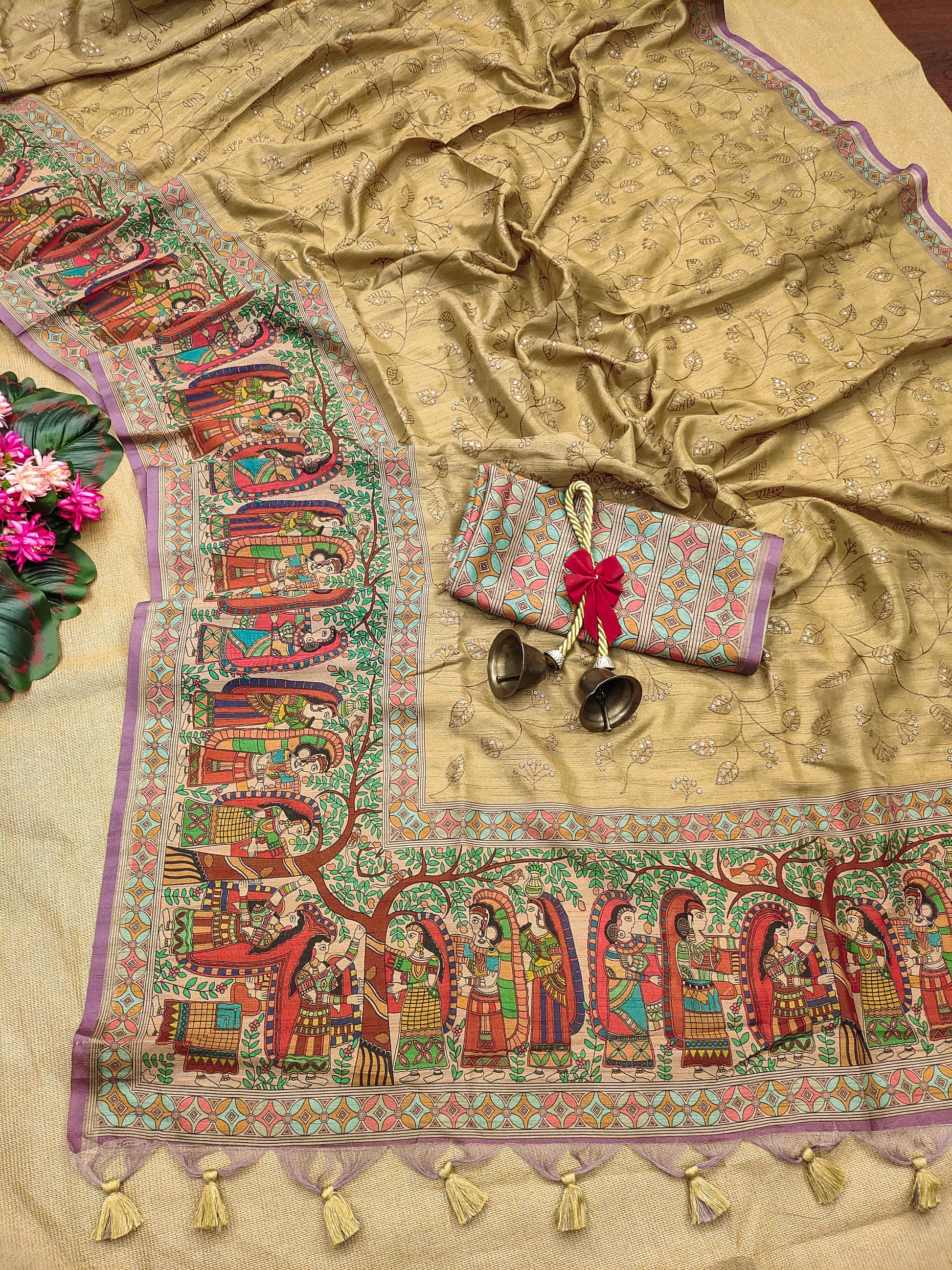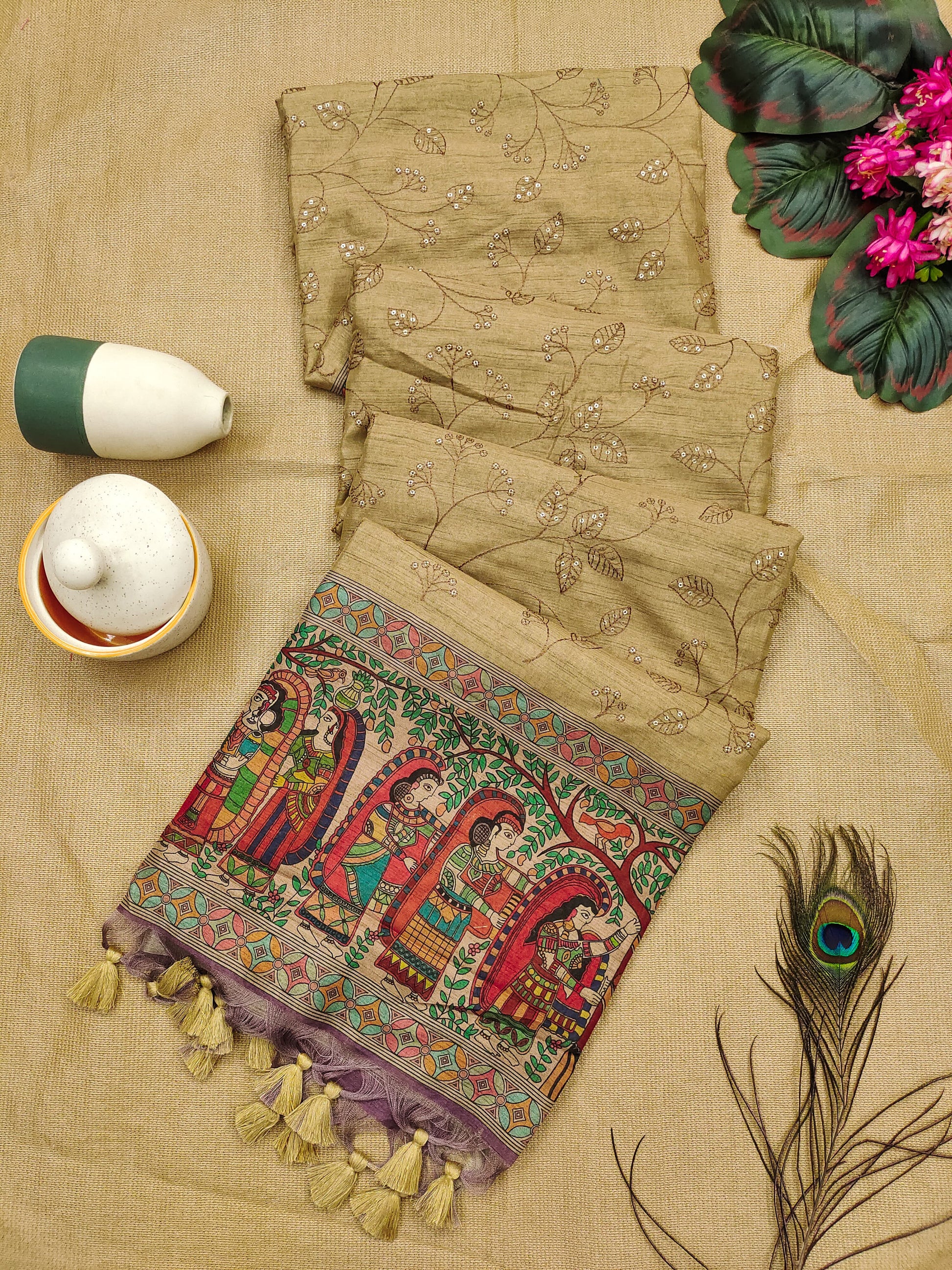 Premium Tussar silk saree with excellent kalamkari Printed pallu and border with all over body amazing sequence embroidery work and fancy tassels with running blouse piece.