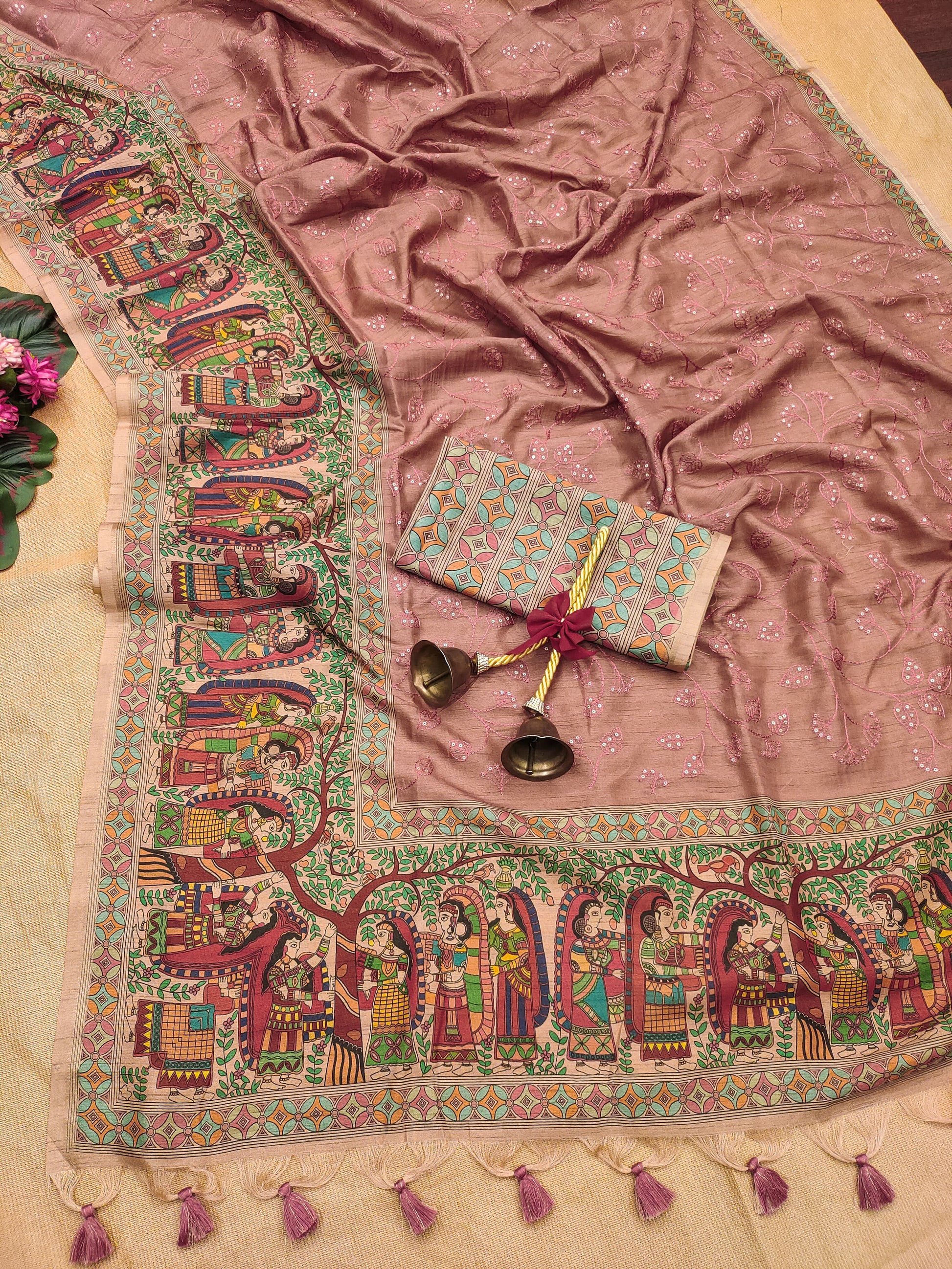 Premium Tussar silk saree with excellent kalamkari Printed pallu and border with all over body amazing sequence embroidery work and fancy tassels with running blouse piece