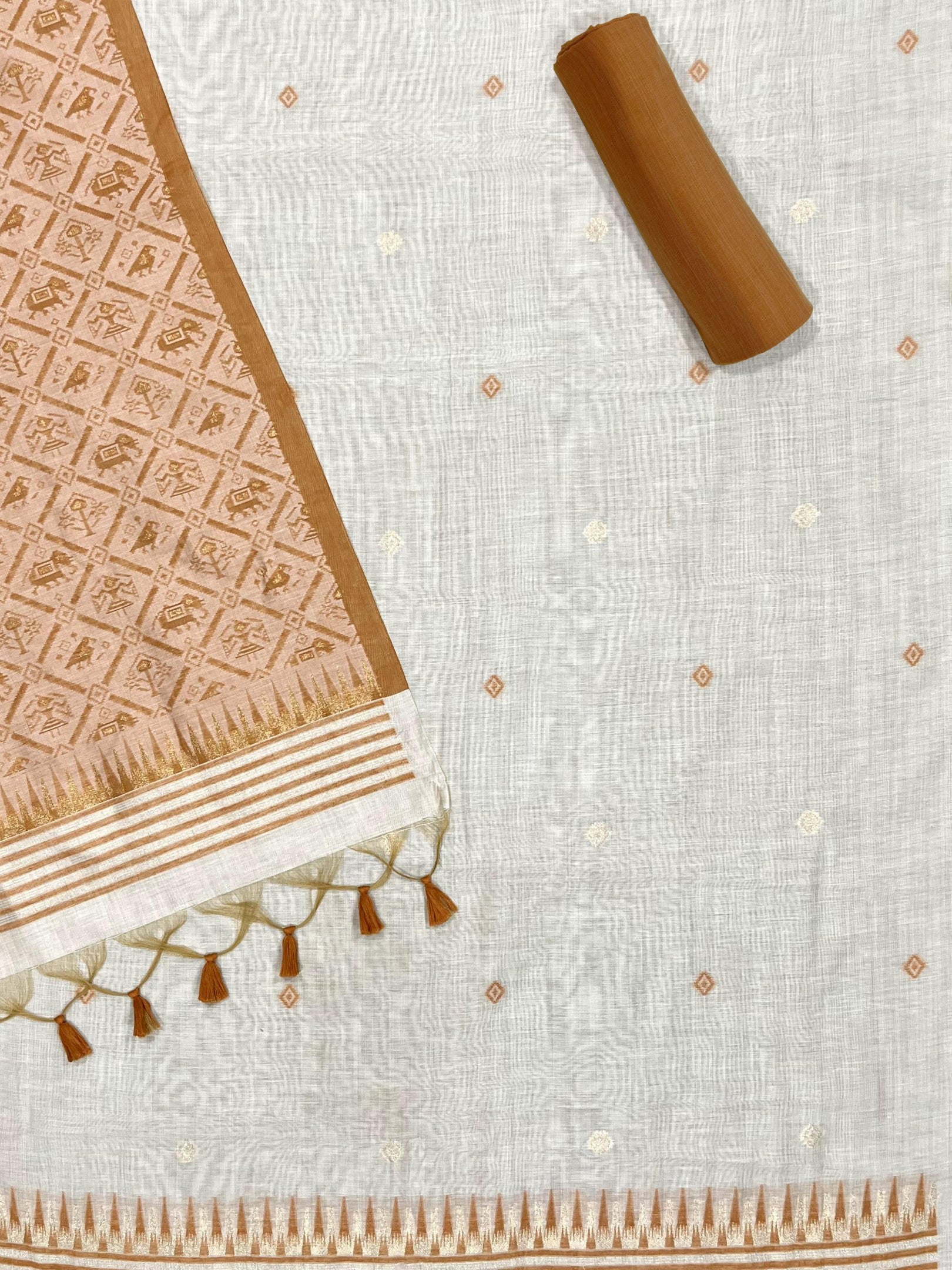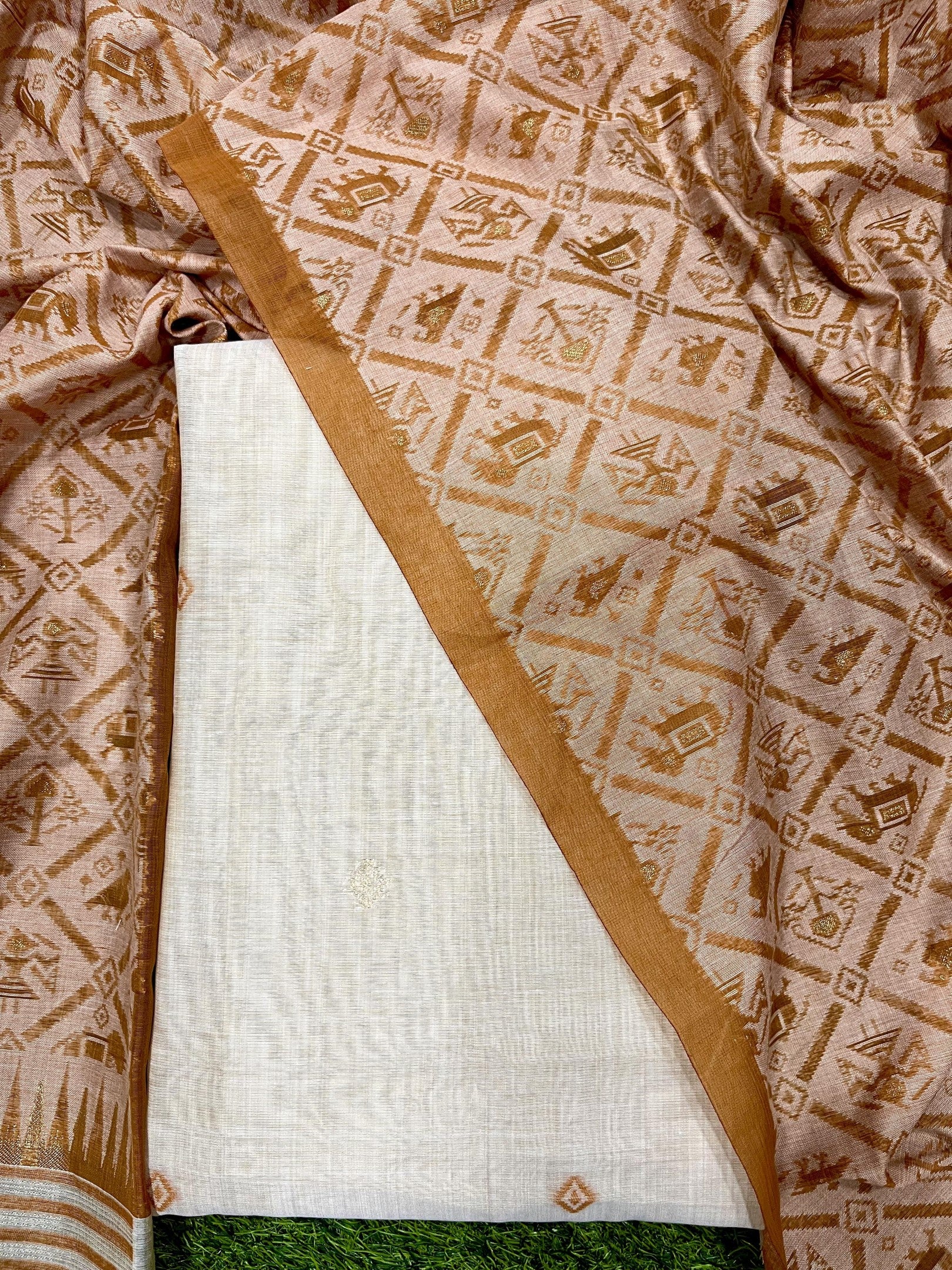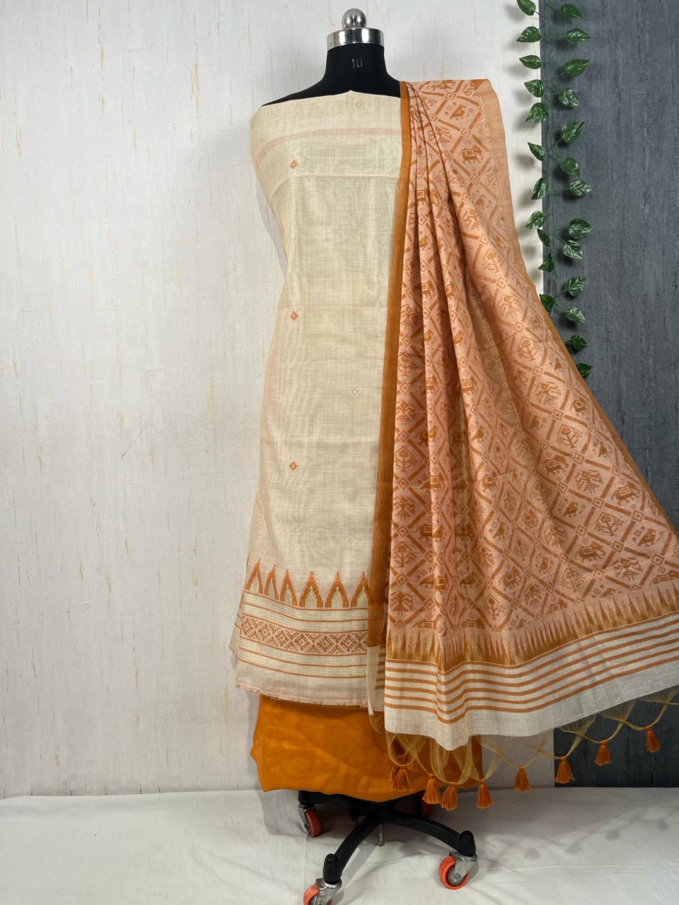 PRESENTING NEW CONCEPT UNSTITCHED DRESS SALWAR SUITS , FABRIC - PURE MUGA COTTON WITH UNIQUE TEMPLE WEAVING ON BODY WITH CONTRAST DUPATTA AND BOTTOM, DETAILS : CONTAIN 3 PIS SET , 1)UNSTITCH TOP LENGHT 2.5 METER , 2)UNSTITCH BOTTOM 2.3 METER, 3)PATOLA STYLR DUPATTA 2.25 MTR WITH FANCY BORDER