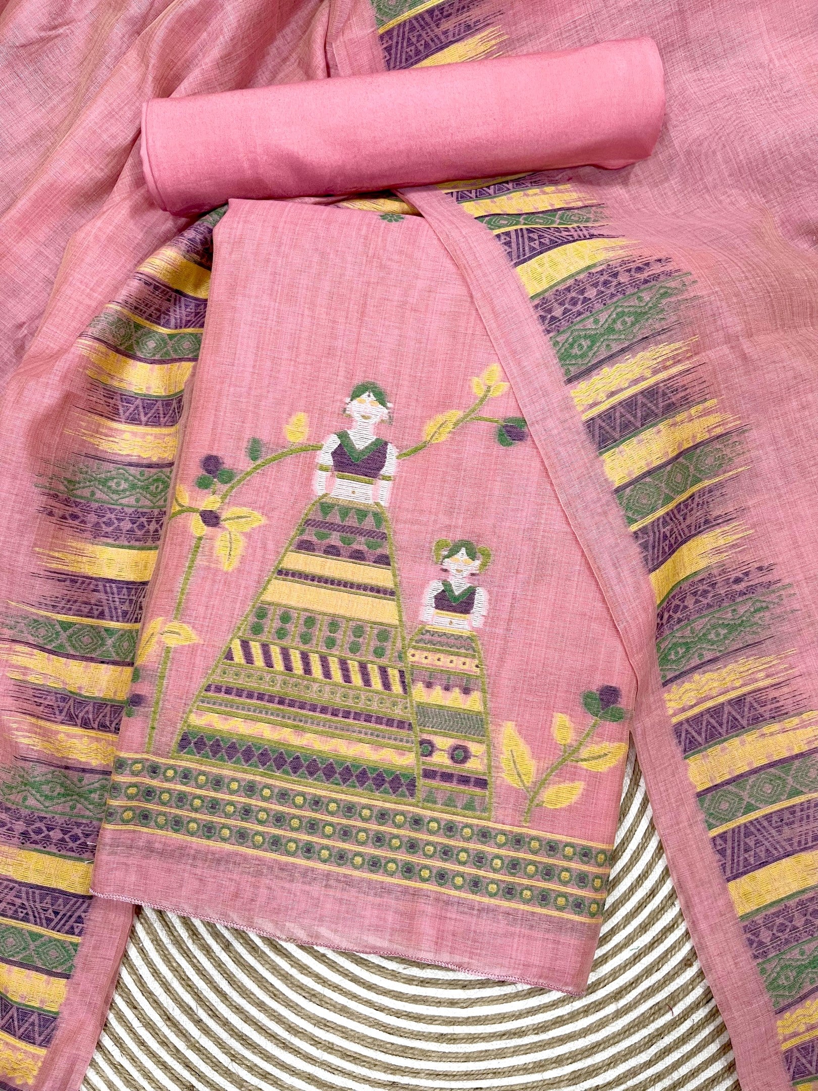 PRESENTING NEW CONCEPT UNSTITCHED DRESS SALWAR SUITS , FABRIC - PURE MUGA SILK WITH UNIQUE FLORAL WEAVING ON BODY WITH CONTRAST DUPATTA AND BOTTOM, DETAILS : CONTAIN 3 PIS SET , 1)UNSTITCH TOP LENGHT 2.5 METER , 2)UNSTITCH BOTTOM 2.5 METER, 3)DUPATTA 2.25 MTR WITH FANCY BORDER