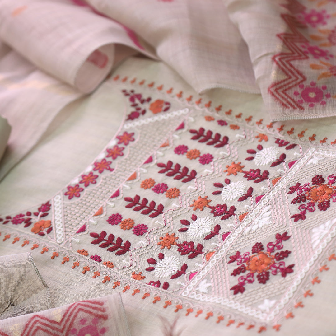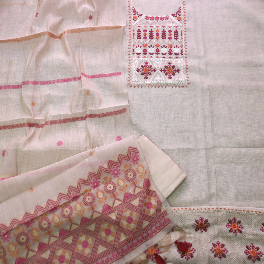PURE LINEN COTTON TOP WITH UNIQUE EMBROIDERED ON BODY WITH PURE MUGA COTTON WEAVING DUPATTA AND BOTTOM
