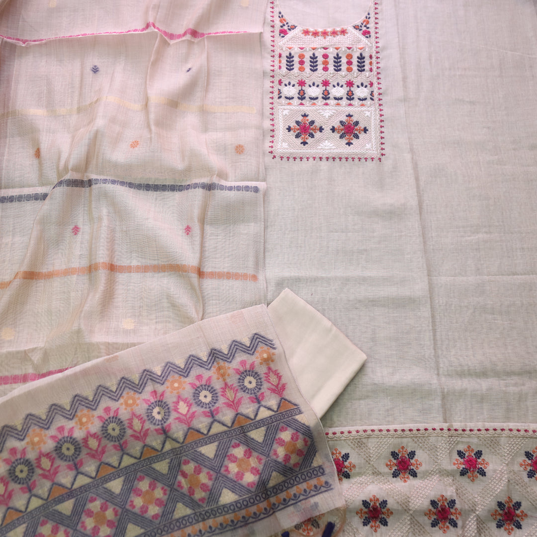 PURE LINEN COTTON TOP WITH UNIQUE EMBROIDERED ON BODY WITH PURE MUGA COTTON WEAVING DUPATTA AND BOTTOM