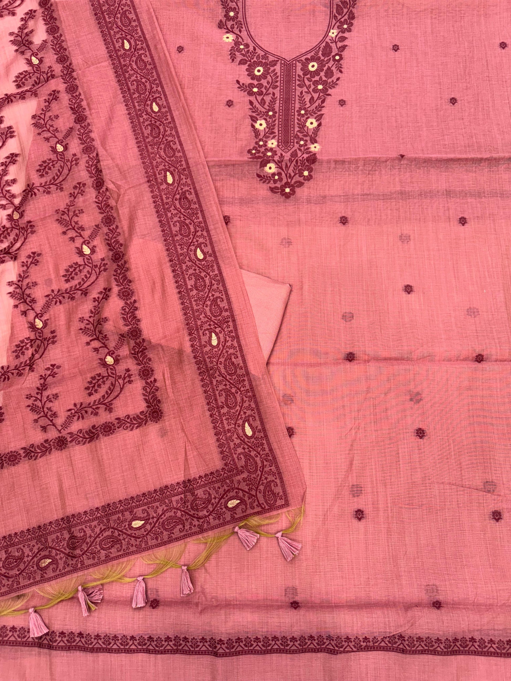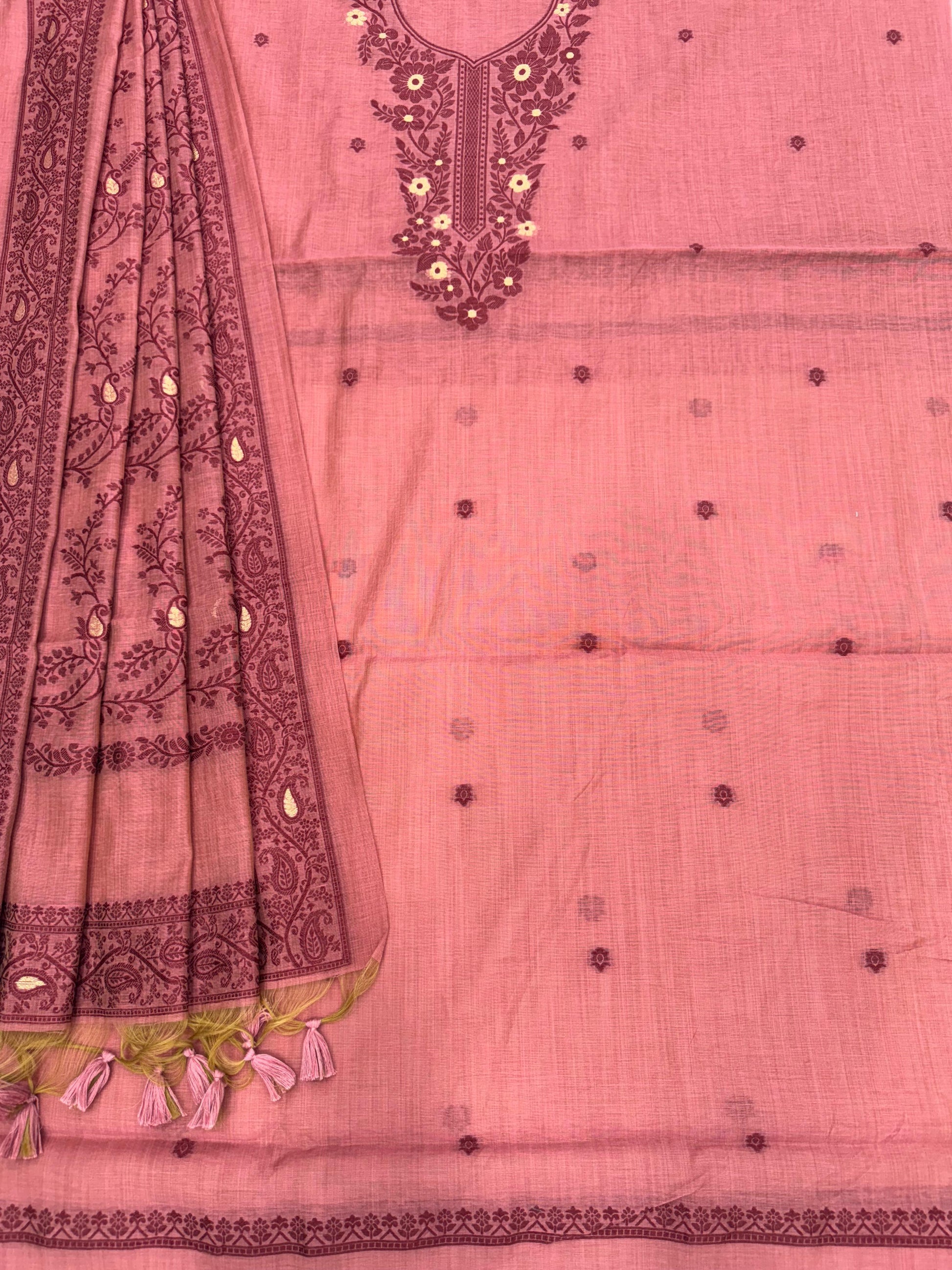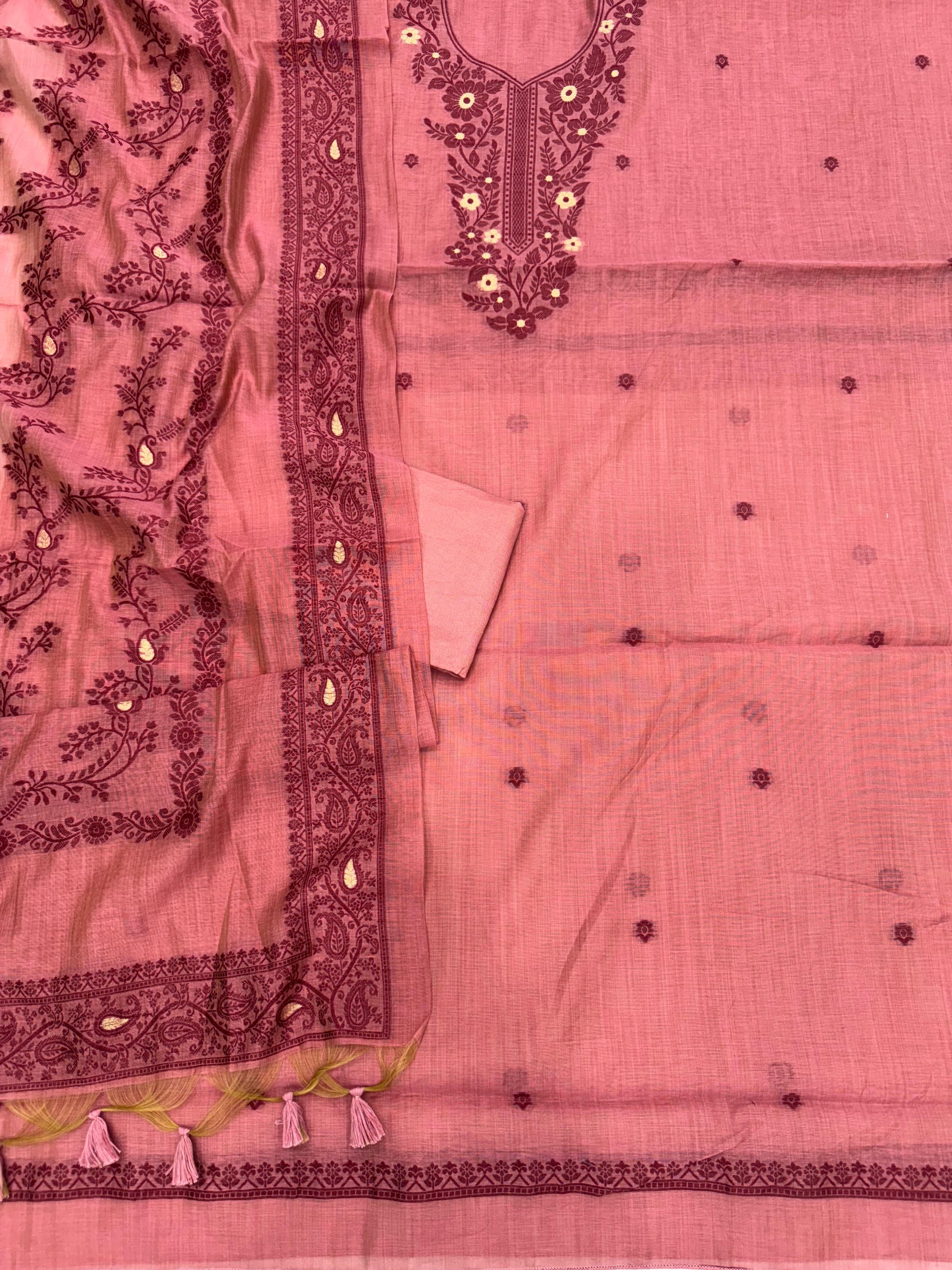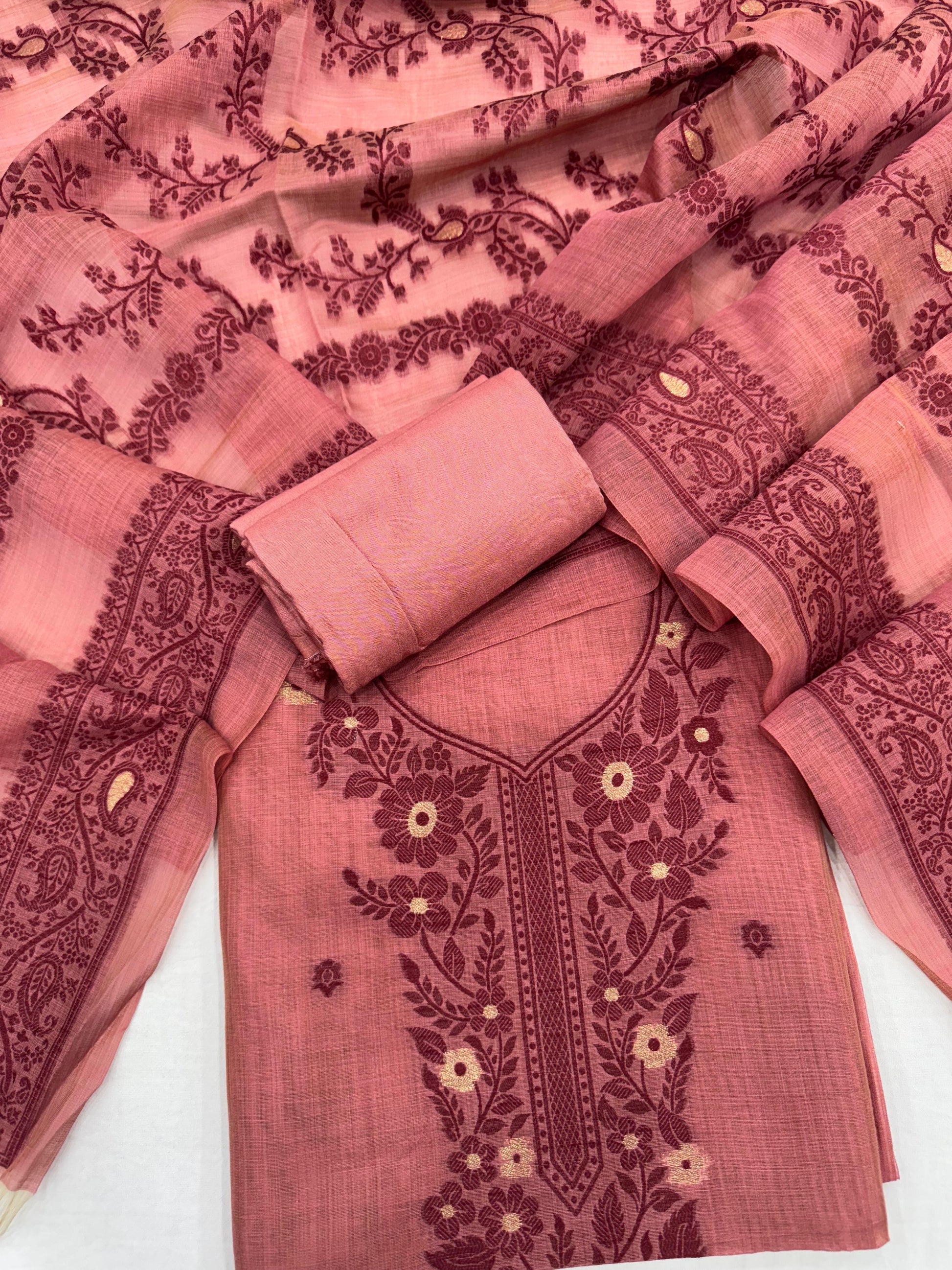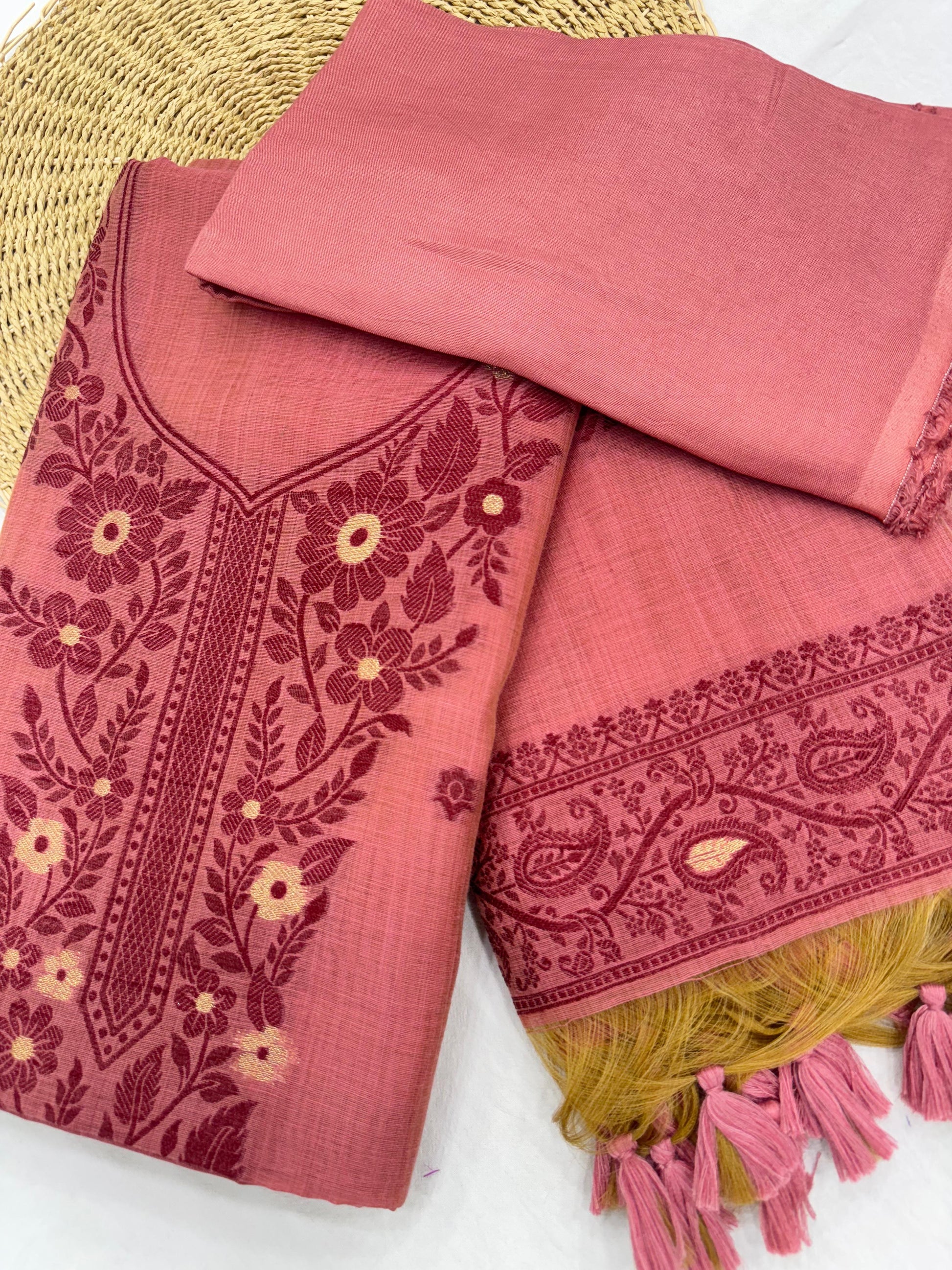 PURE SOFT MUGA COTTON SUIT WITH FLORAL TYPE WEAVING ON NECK WITH ALL OVER WEAVING BUTTIS WITH ALL OVER WEAVING CLASSIC DUPATTA AND BOTTOM