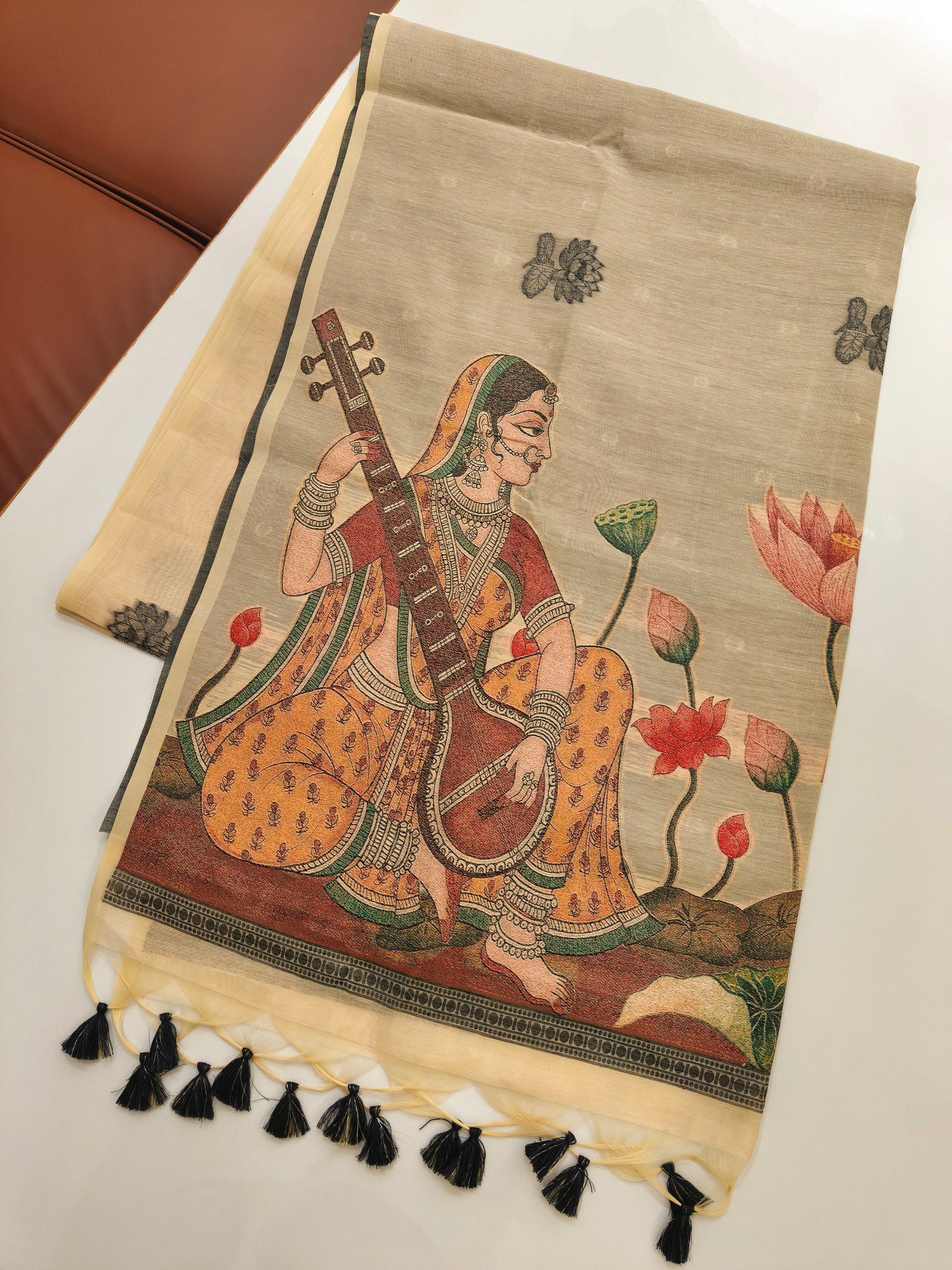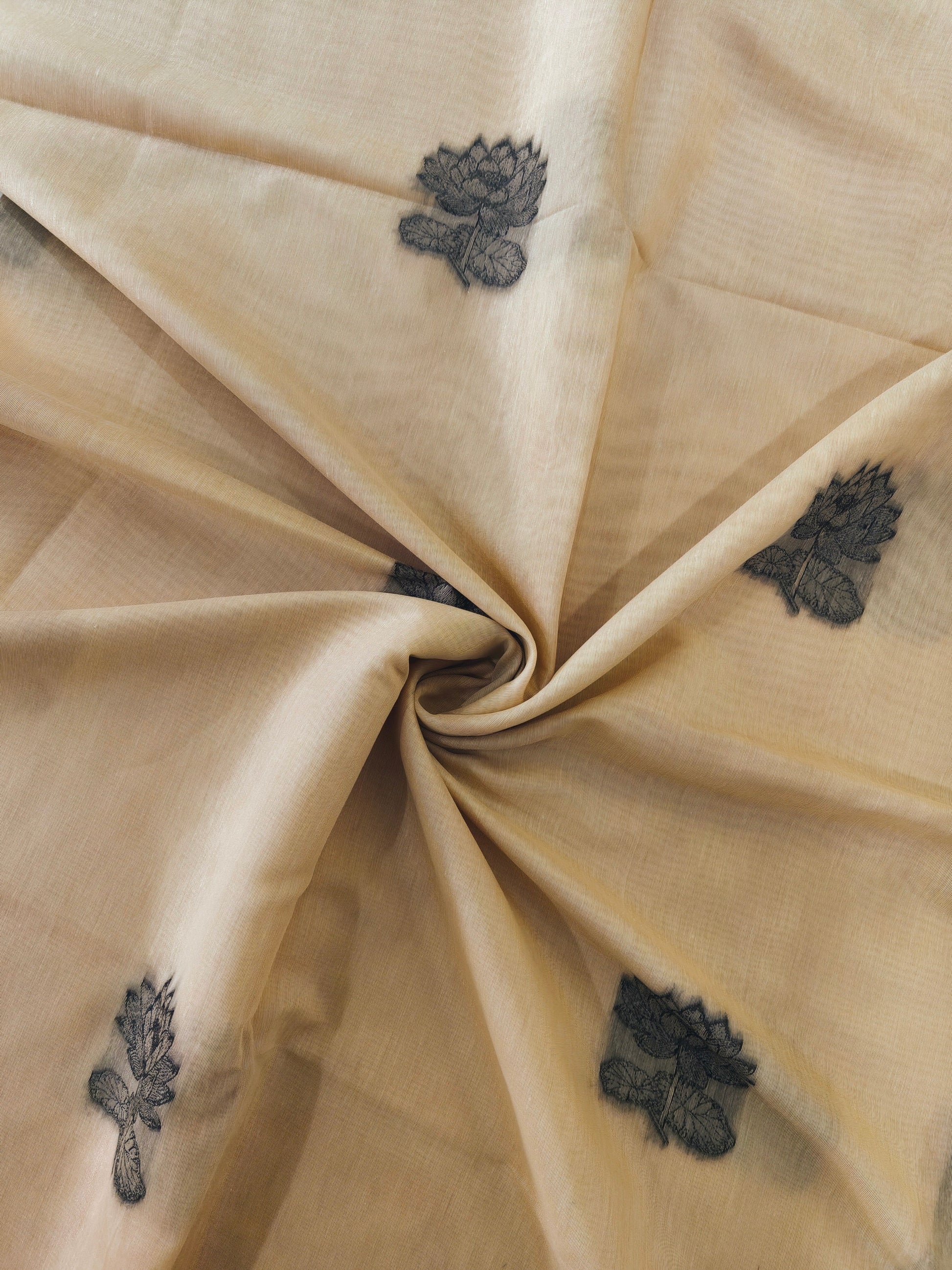 Premium Soft Chanderi cotton saree with traditional Mithila pattern weaving pallu which gives pretty look with all over weaving Shaded lotus and fancy tassels with Contrast blouse piece