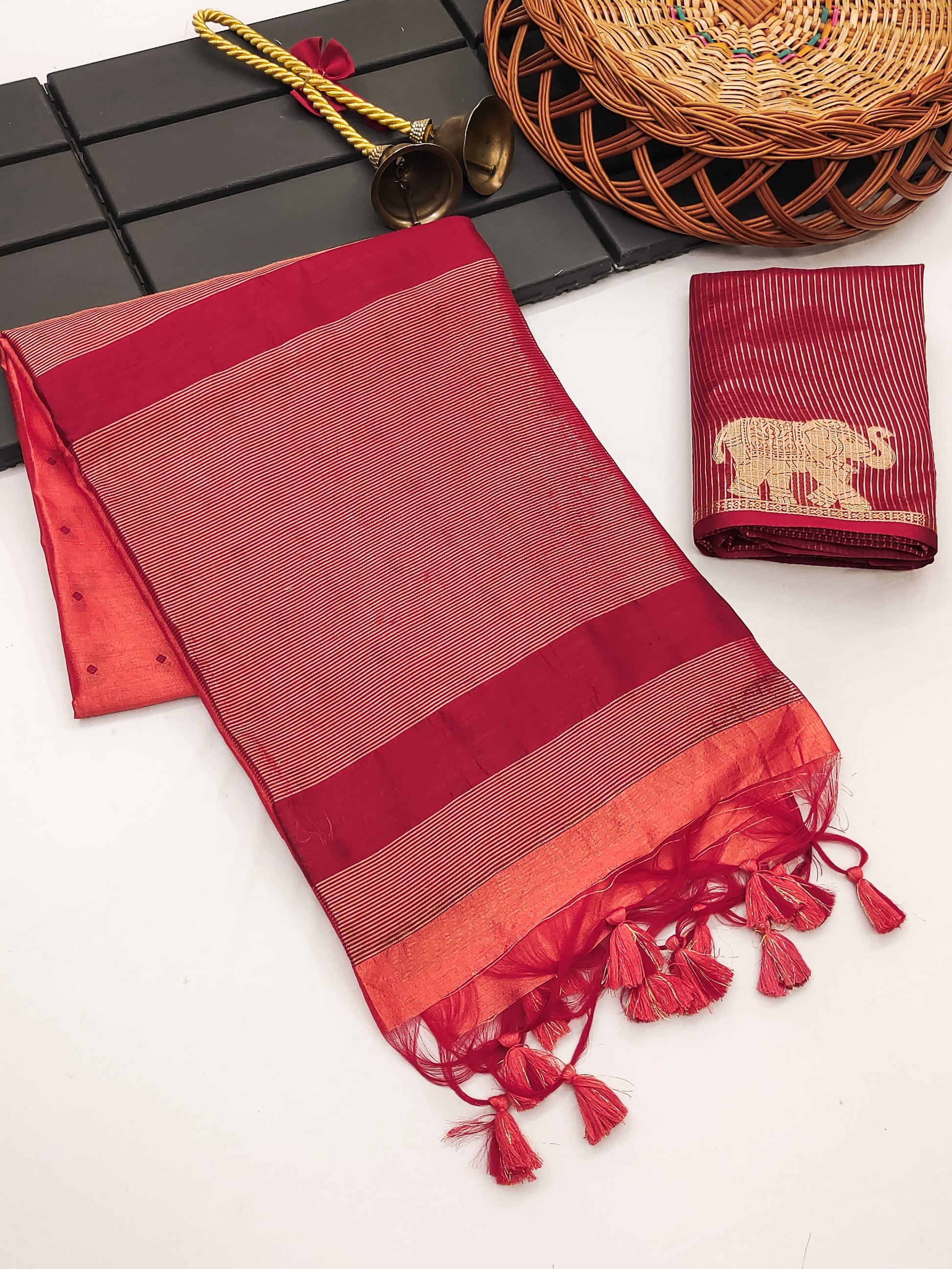 PREMIUM KHADI RAW SILK SAREE WITH ALL OVER BANDHANI STYLE BUTTI WEAVES AND VERY WELL DESIGNED TRADITIONAL ELEPHANT BORDER WITH ZARI LINNING PALLU AND CONTRAST BLOUS
