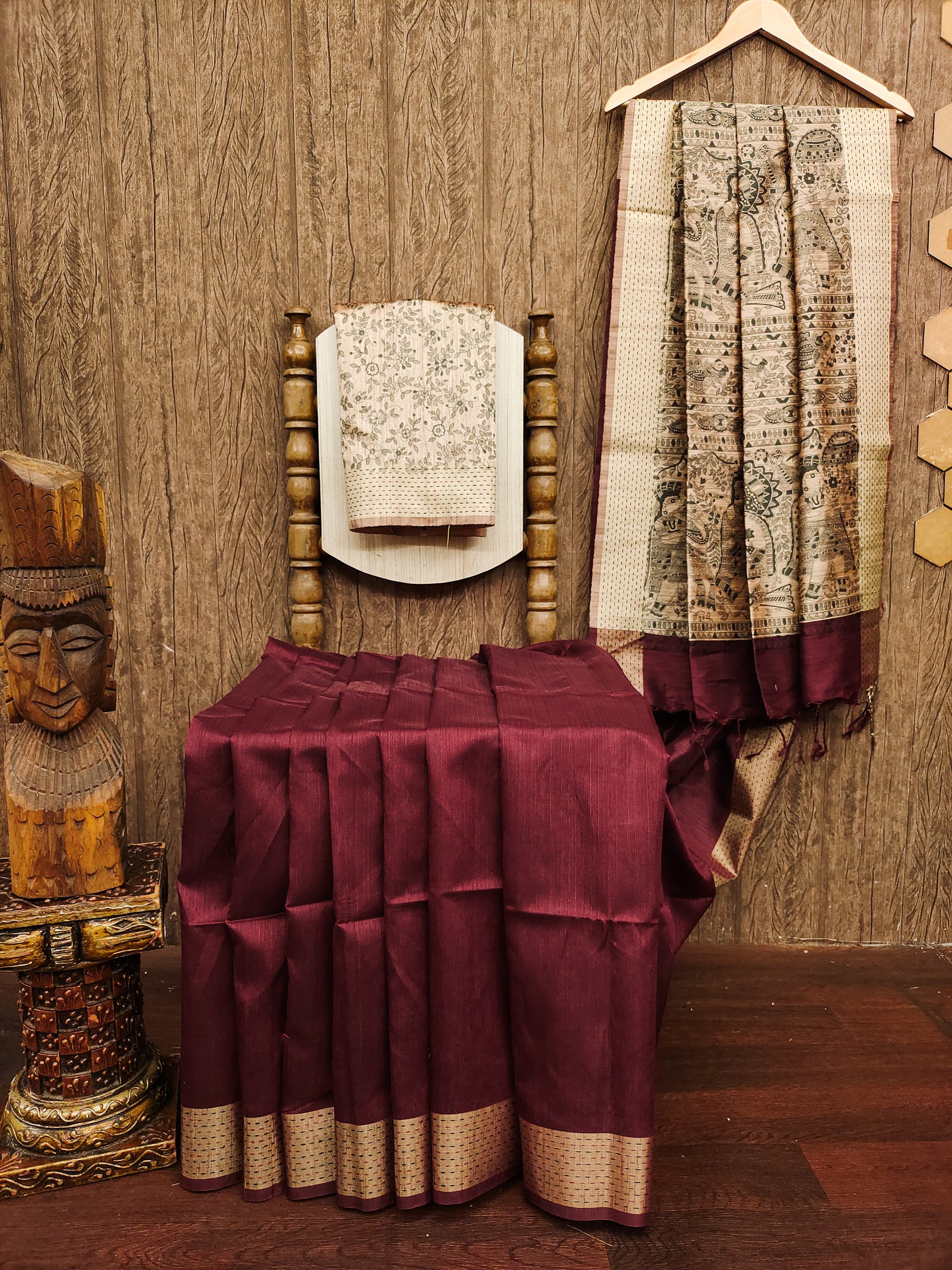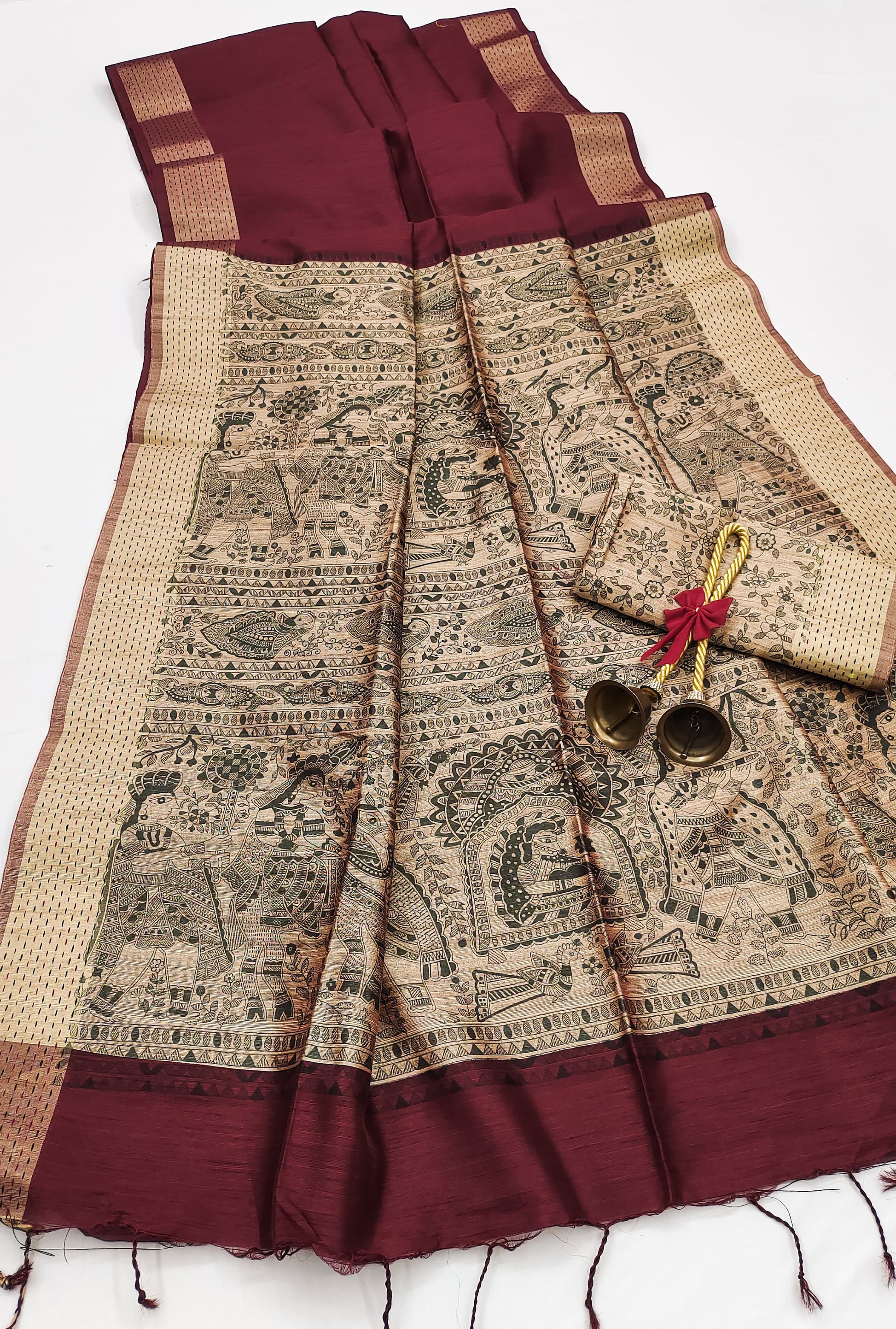 Soft Khadi Raw silk saree with beautiful madhubani print on pallu and zari weaving border with traditional kantha stitch on it with classic weaving texture on all over the body and printed blouse piece