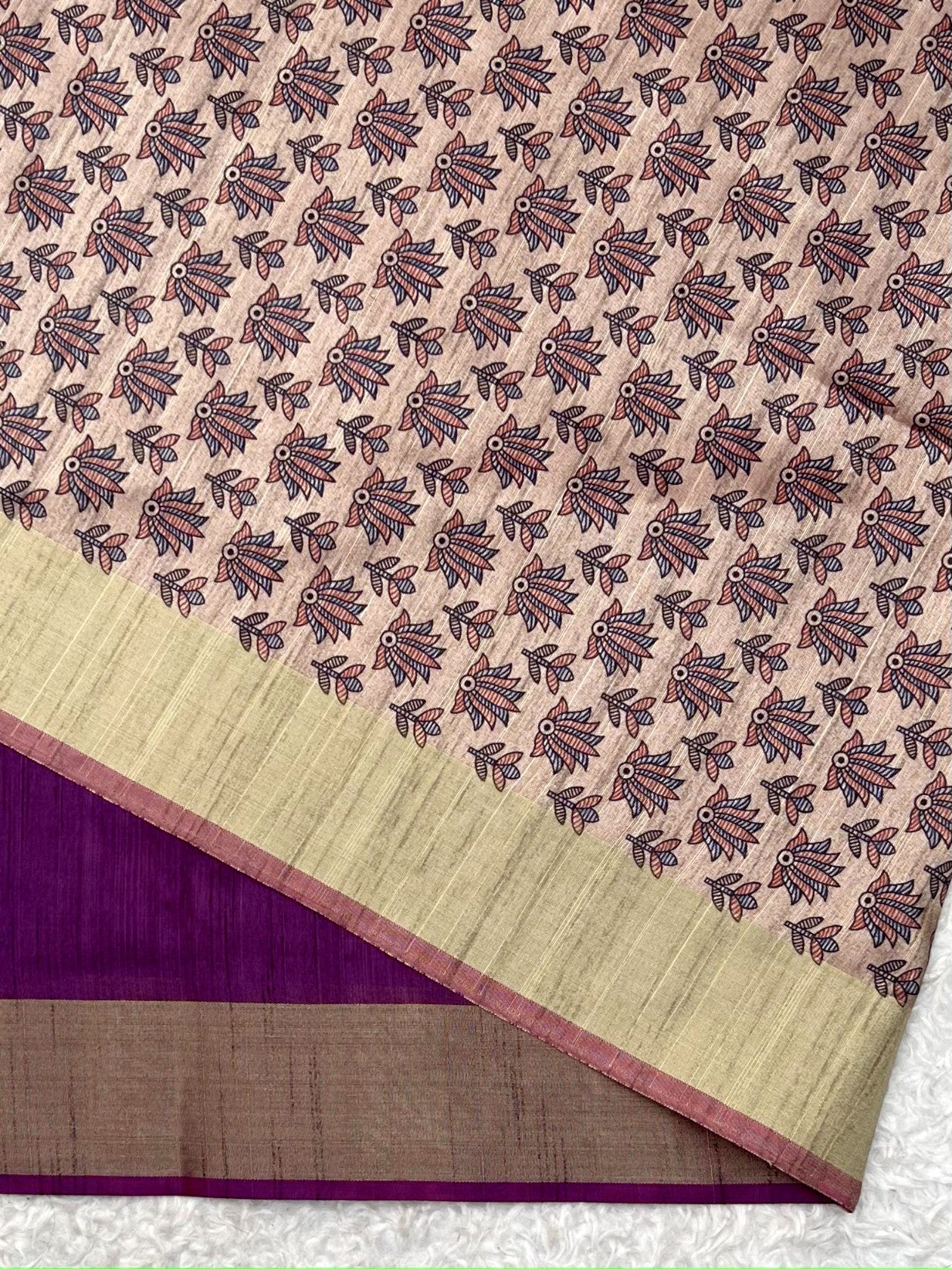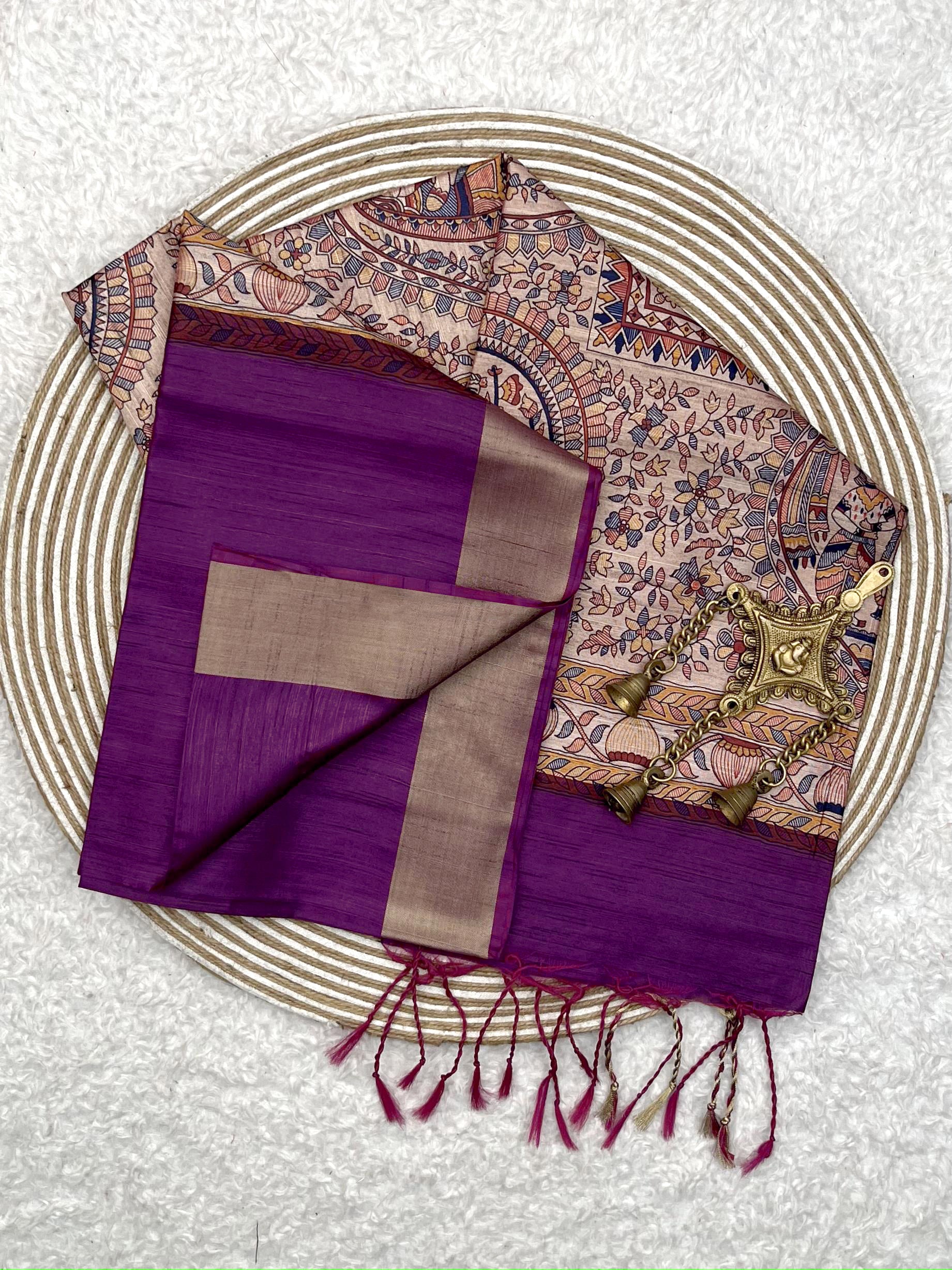 Soft Khadi Raw silk saree with beautiful madhubani print on pallu and zari weaving border with classic weaving texture on all over the body and printed blouse piec