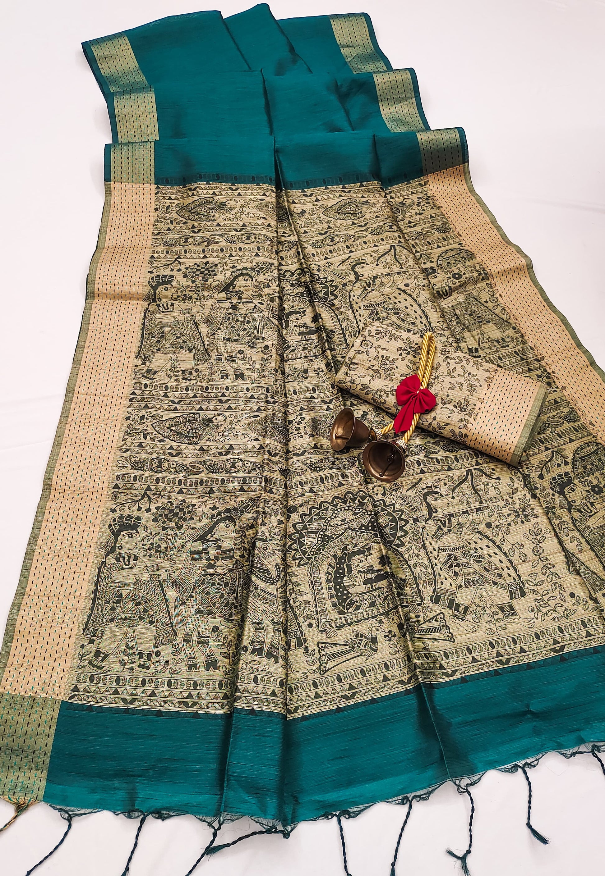 Soft Khadi Raw silk saree with beautiful madhubani print on pallu and zari weaving border with traditional kantha stitch on it with classic weaving texture on all over the body and printed blouse piece