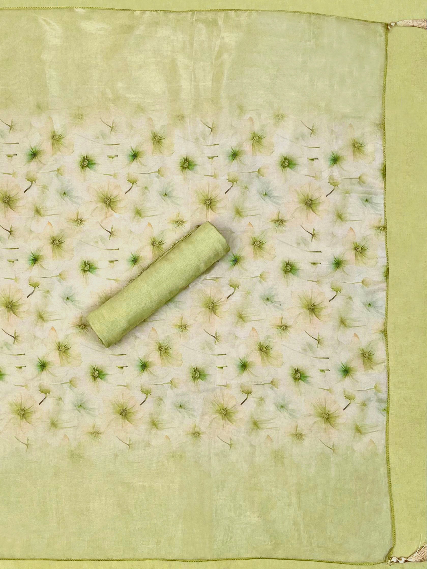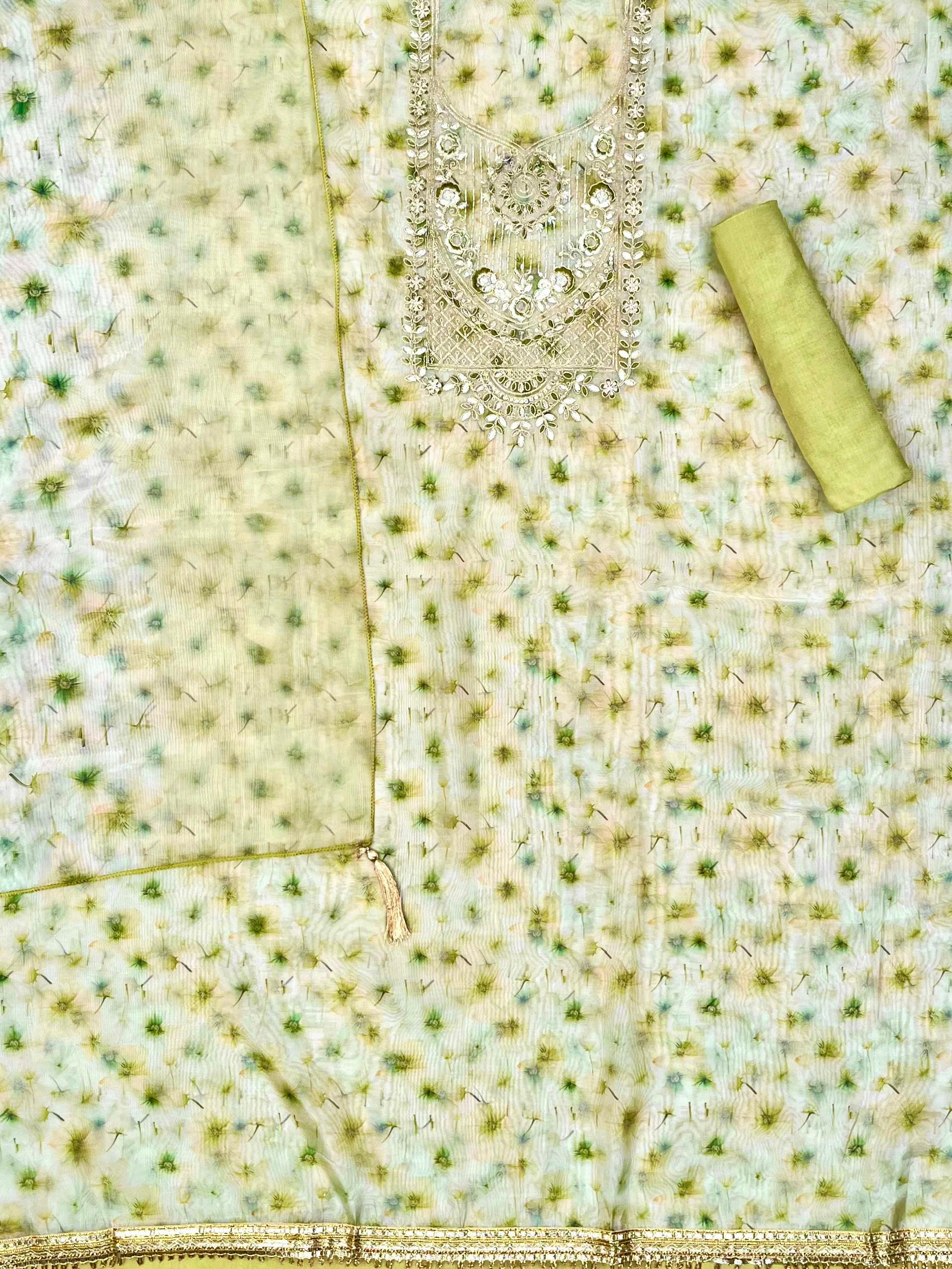 | SOFT ORGANZA SUIT WITH DORI AND GOTA PATI EMBROIDERED NECK WORK WITH LACE WITH ALL OVER FLORAL PRINT AND RUNNING DUPATTA WITH COTTON BOTTOM |