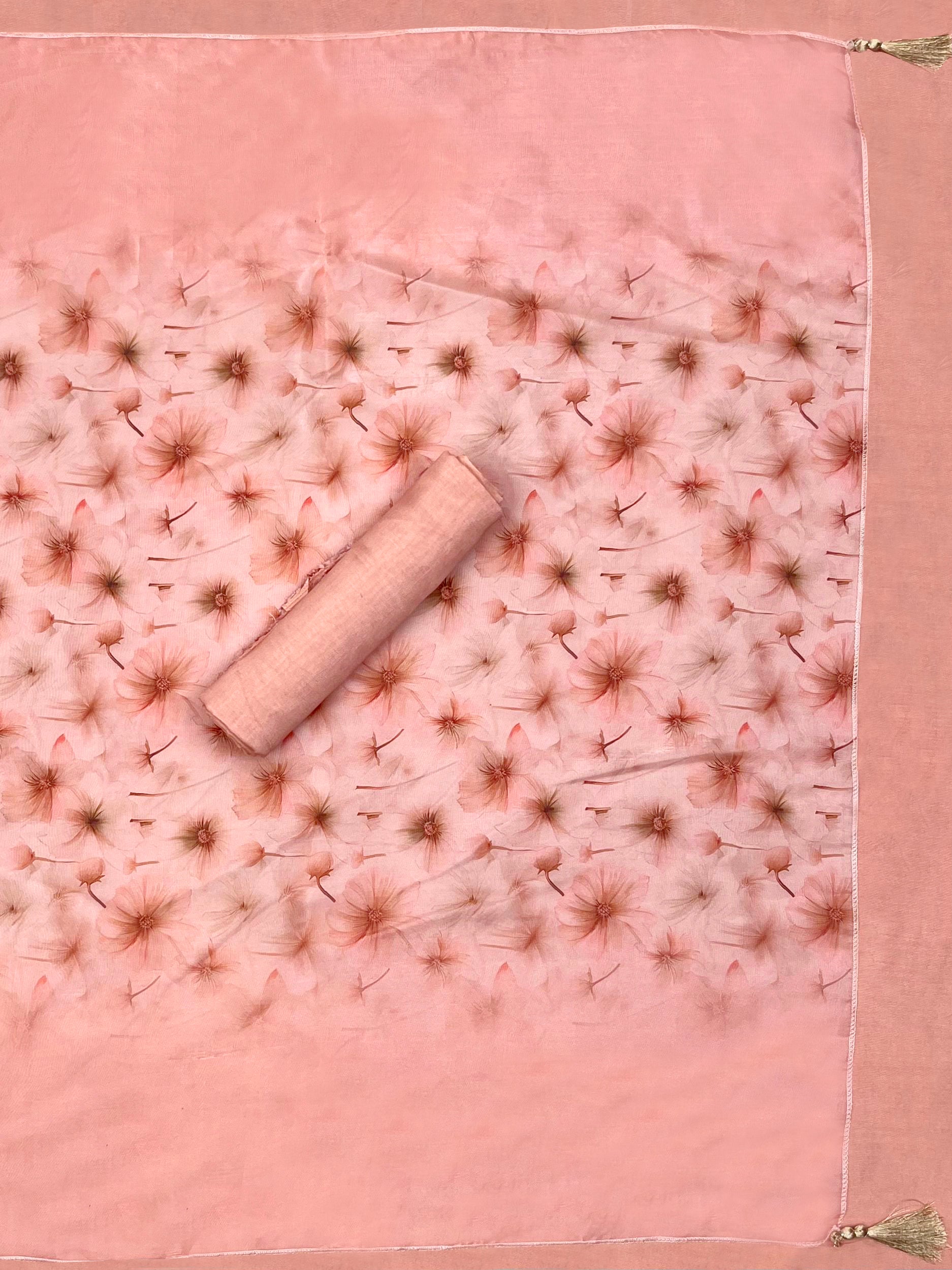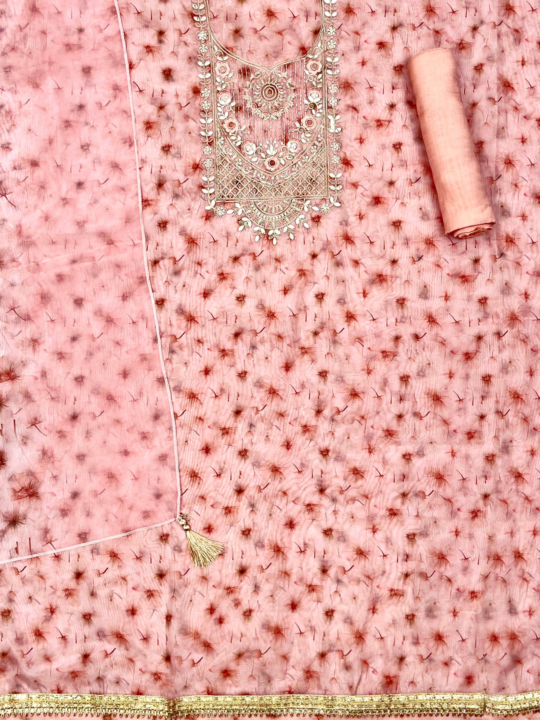 SOFT ORGANZA SUIT WITH DORI AND GOTA PATI EMBROIDERED NECK WORK WITH LACE WITH ALL OVER FLORAL PRINT AND RUNNING DUPATTA WITH COTTON BOTTOM