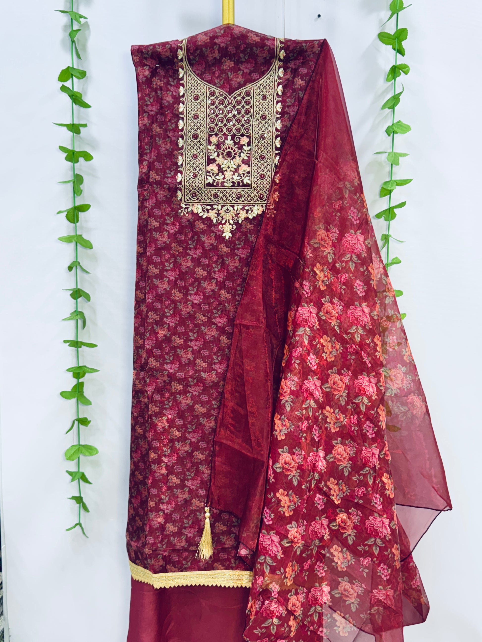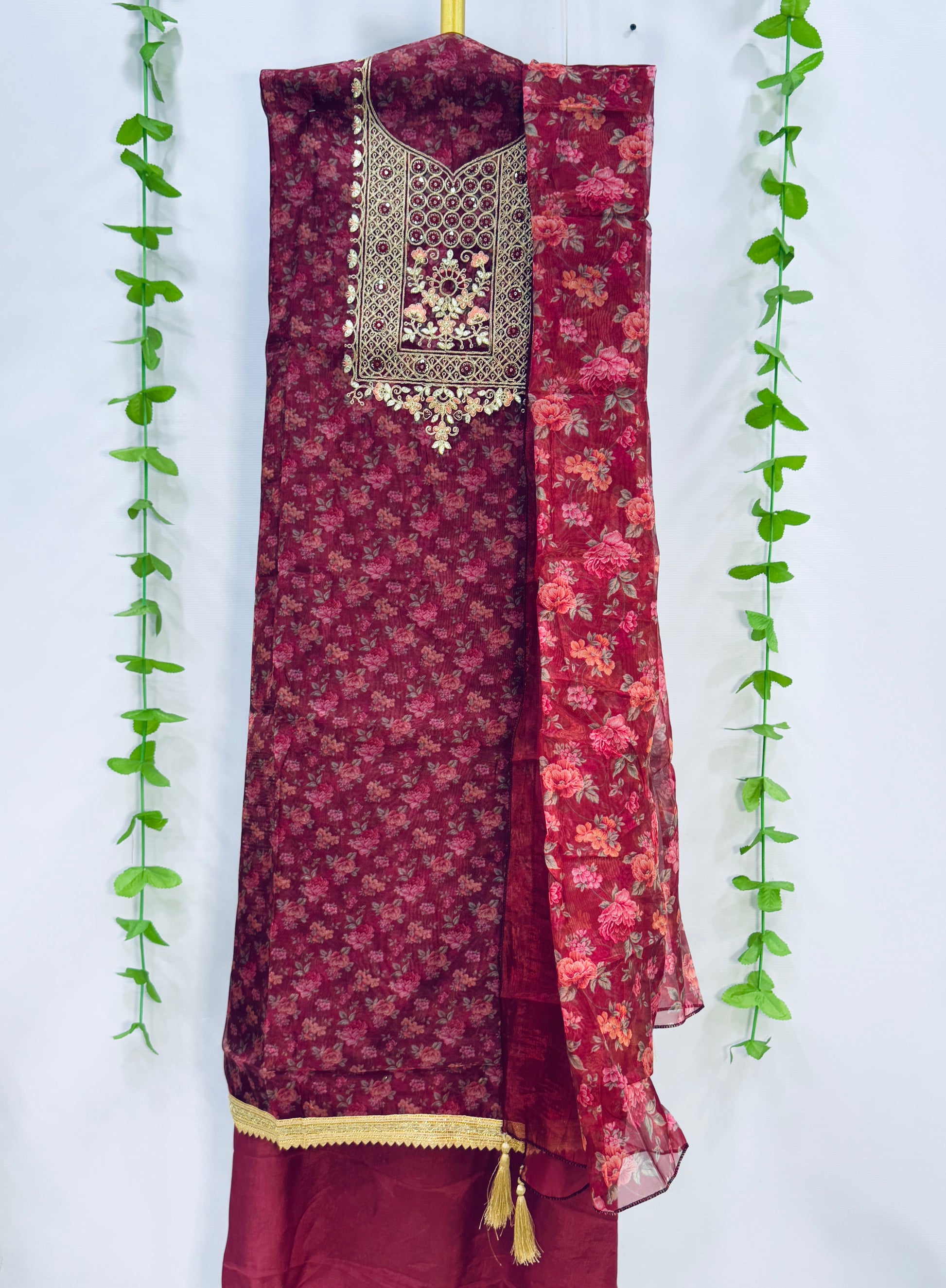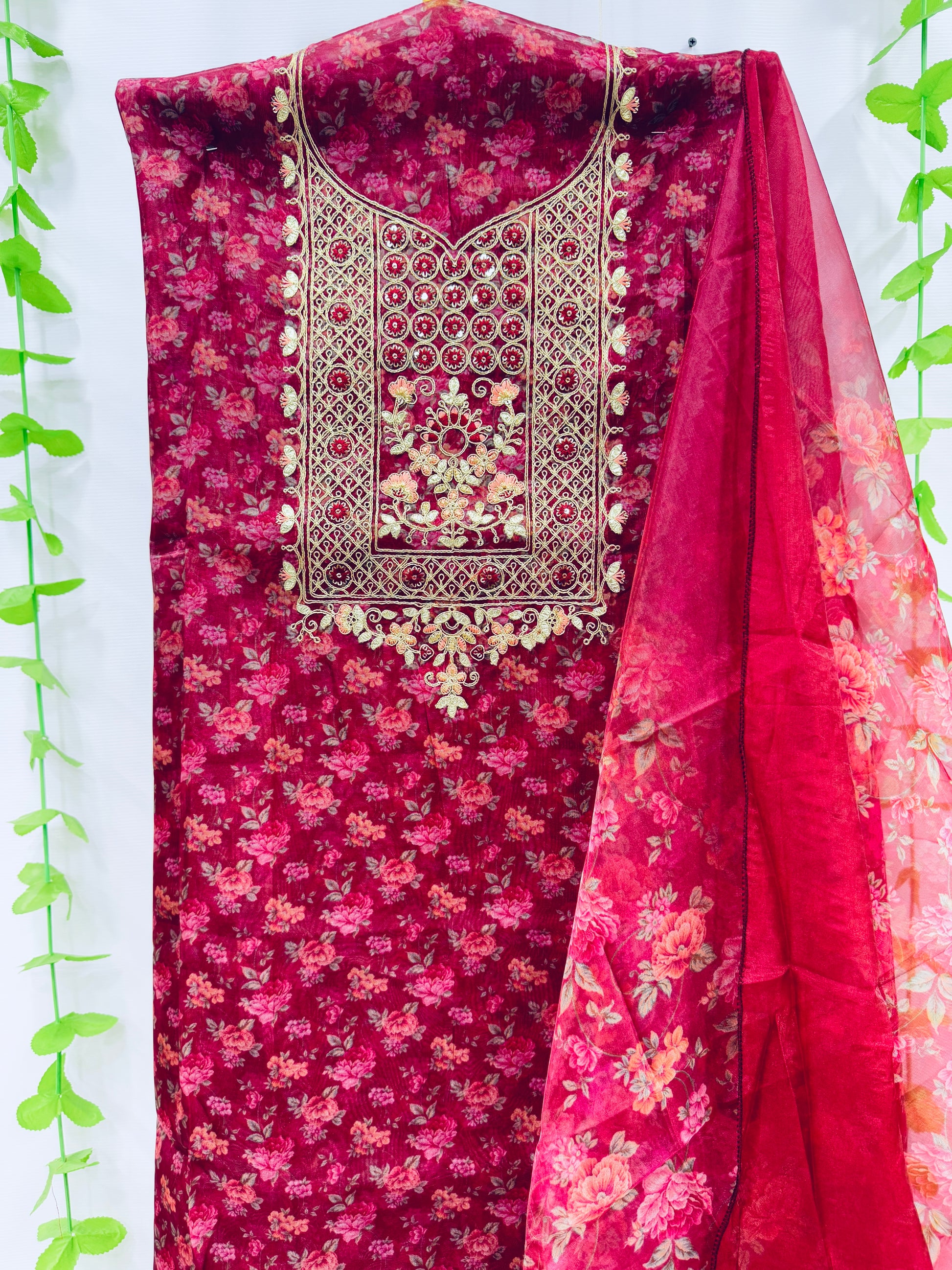 SOFT ORGANZA SUIT WITH DORI AND GOTA PATI EMBROIDERED NECK WORK WITH LACE WITH ALL OVER FLORAL PRINT AND RUNNING DUPATTA WITH COTTON BOTTOM