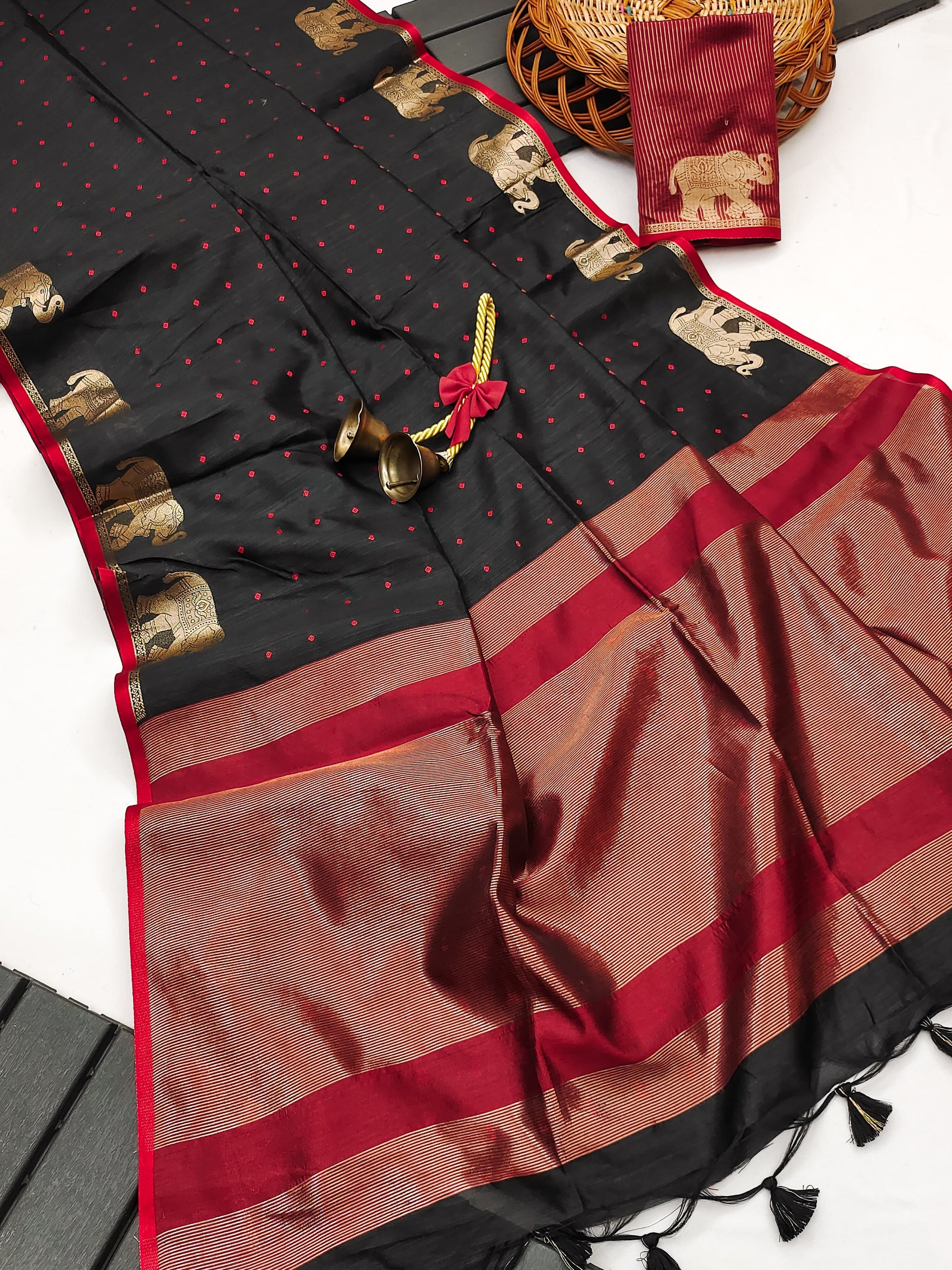PREMIUM KHADI RAW SILK SAREE WITH ALL OVER BANDHANI STYLE BUTTI WEAVES AND VERY WELL DESIGNED TRADITIONAL ELEPHANT BORDER WITH ZARI LINNING PALLU AND CONTRAST BLOUSE