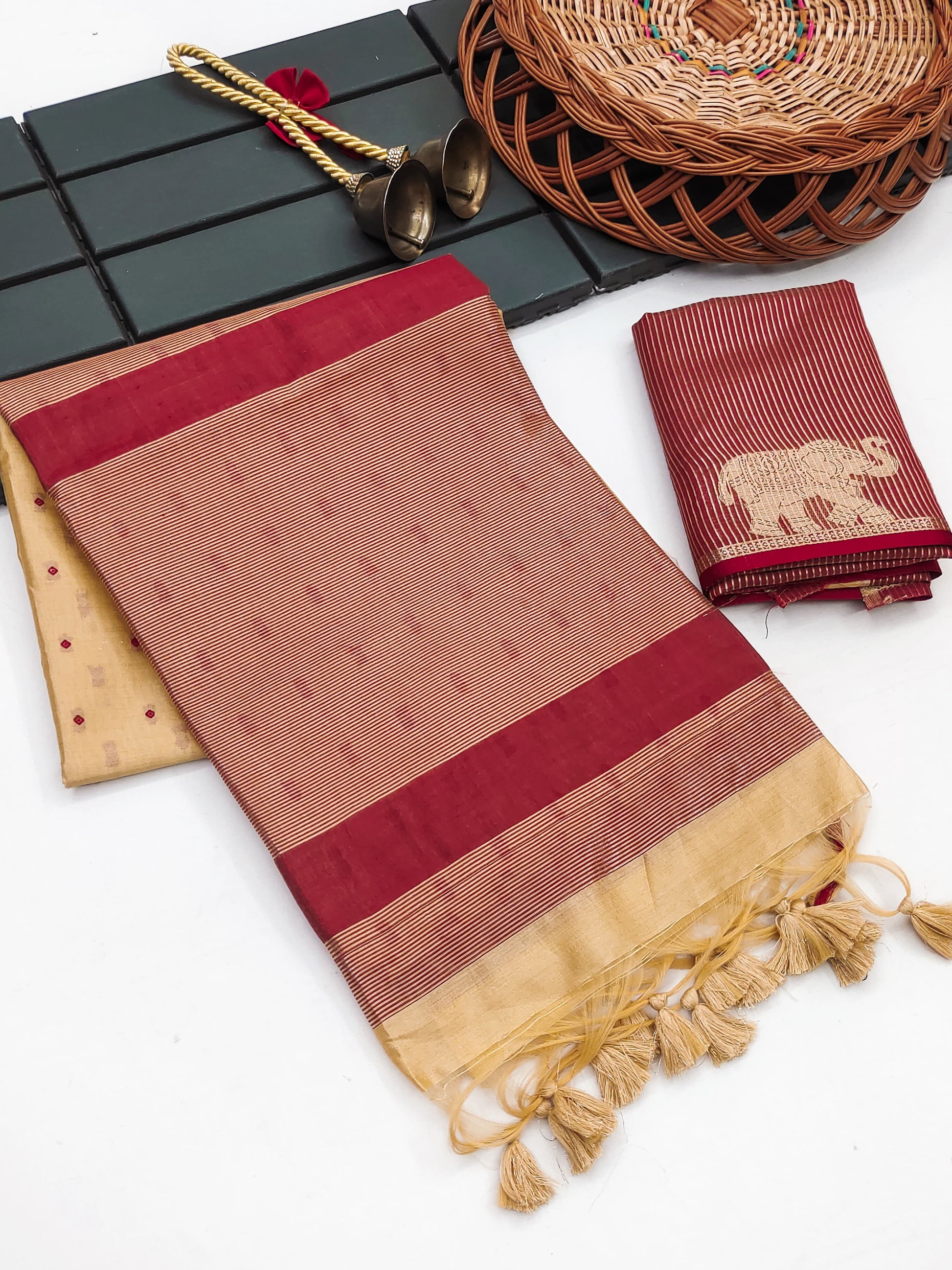 PREMIUM KHADI RAW SILK SAREE WITH ALL OVER BANDHANI STYLE BUTTI WEAVES AND VERY WELL DESIGNED TRADITIONAL ELEPHANT BORDER WITH ZARI LINNING PALLU AND CONTRAST BLOUS