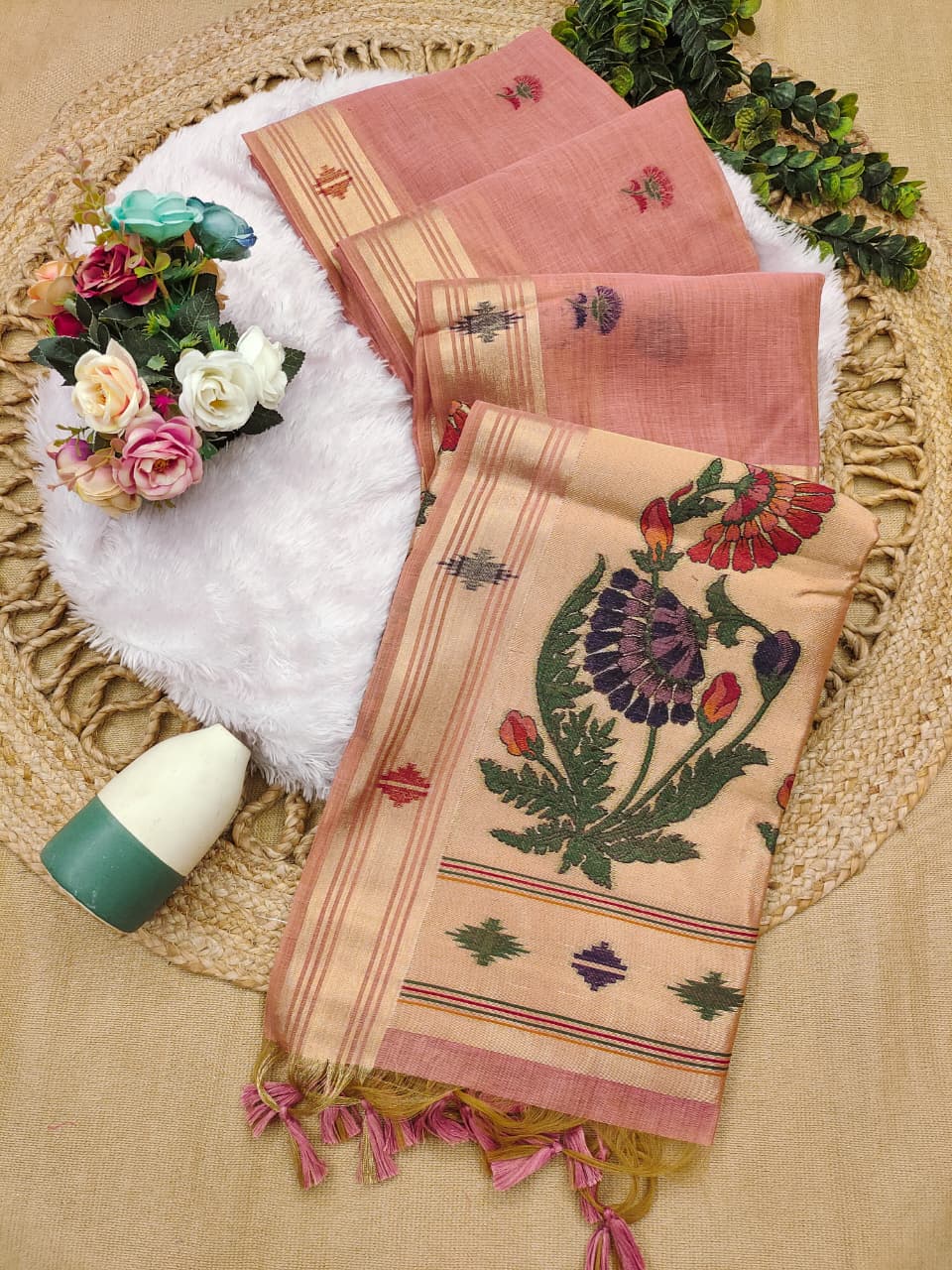 Premium Soft moga cotton paithani pink saree