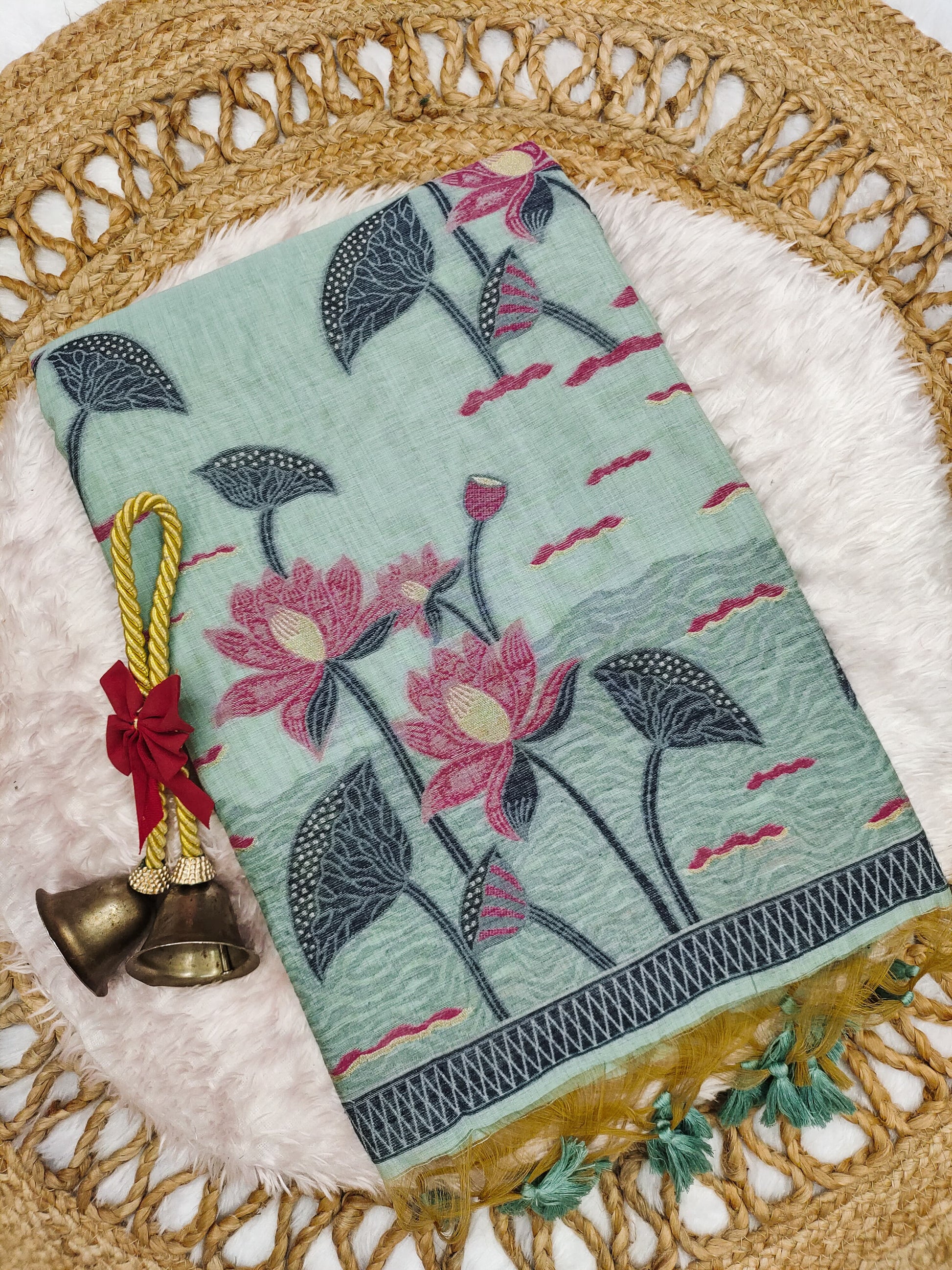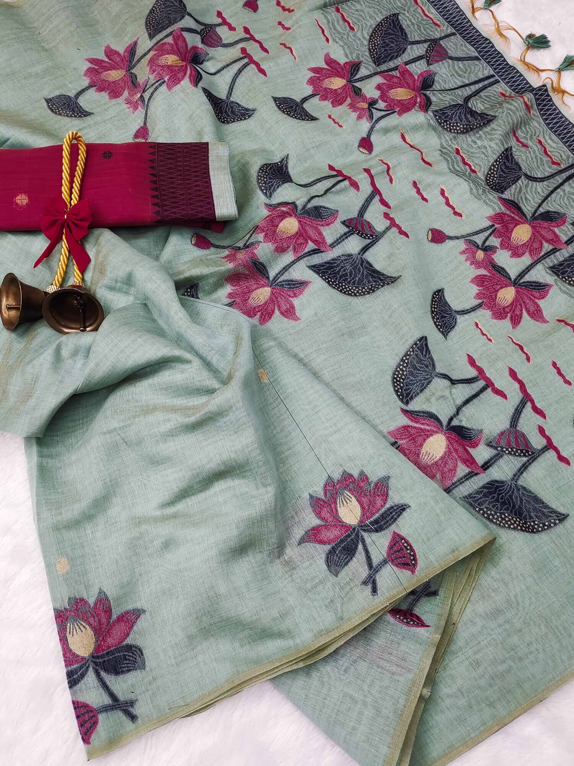 Premium soft Muga Cotton saree with classic colourfull pichwai type lotus weaving pallu with very decent colour touchup on border and all over weaving buttas with fancy tassels and contrast blouse piec